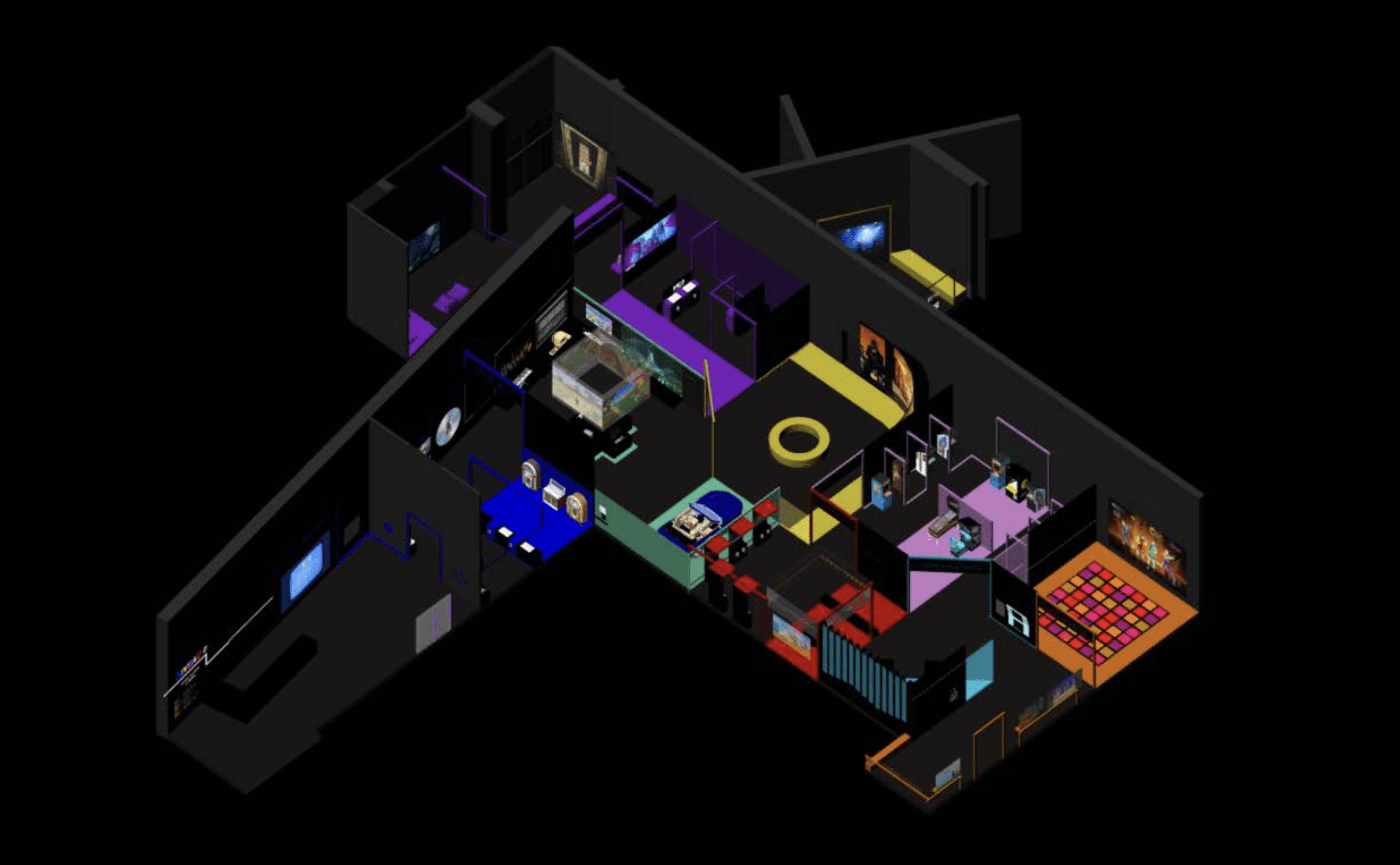 Immersed in a vast black box, visitors embark on a musical journey guided by a colourful architectural framework where each colour represents a theme. The Level 8 exhibition is inspired by the earliest 2D video games, creating a linear, streamlined aesthetic. Following this line, visitors move through areas where the colours change and sometimes spread over the floor or walls. The transition between the eight spaces is marked with coloured signage, symbolising progress to the next level. Influenced by game consoles, the furniture consists of simple geometric shapes. Each area offers a distinct soundscape and projections at different scales, encouraging observation, listening and interaction.