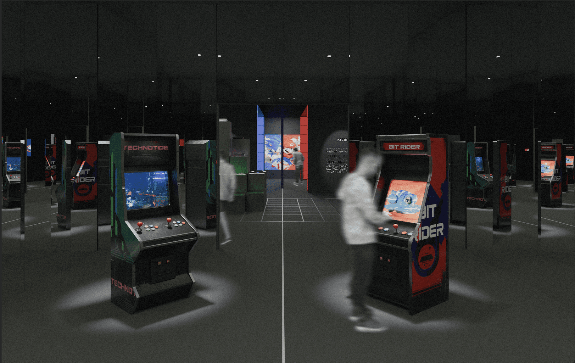 En plus des espaces immersifs (les boîtes), des espaces de transition ont été pensé. Davantage informatifs, avec un contenu plus didactique, ils permettent d’enrichir le visiteur sur l’histoire de la musique de jeux vidéos. Ces espaces ont été placés avant chaque espace immersif pour une meilleure compréh