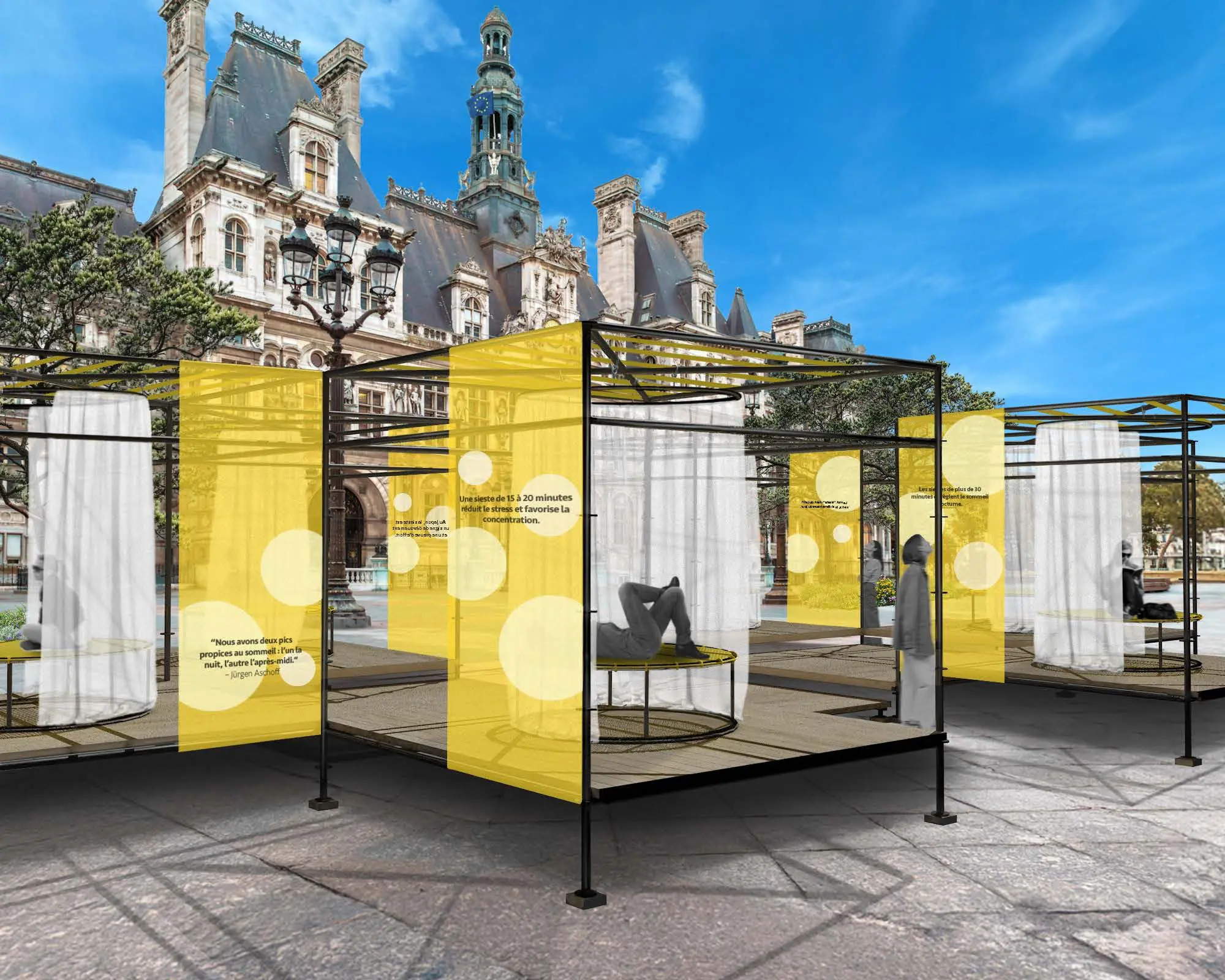 Cette installation n’est pas seulement un lieu de détente, elle porte un message fort en brisant les stéréotypes associés à la sieste et en valorisant le bien-être comme une nécessité contemporaine.