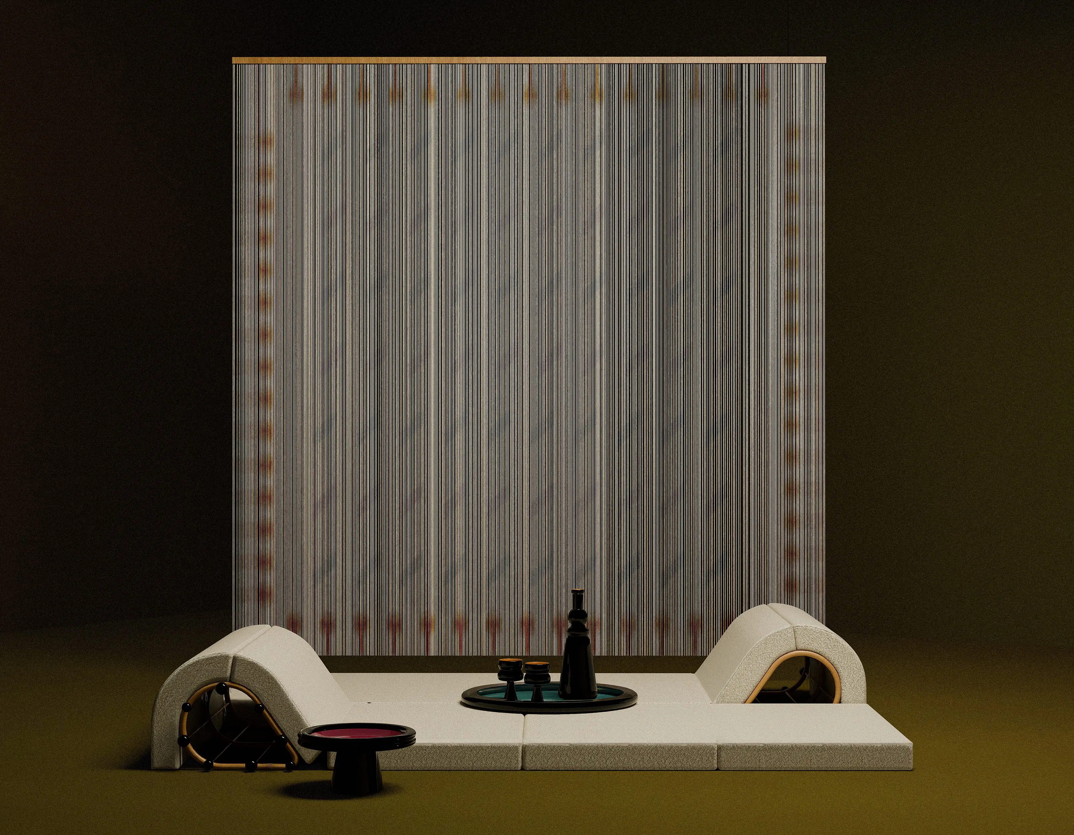 Le lit de banquet est directement inspiré de la posture du banquet romain. J’ai repris cette typologie en imaginant un futon recouvert de laine bouclée, un tissu texturé qui joue avec la sensorialité. Puis, une structure indépendante en rotin cintré ponctuée de sphères en céramique qui vient créer un dossier.