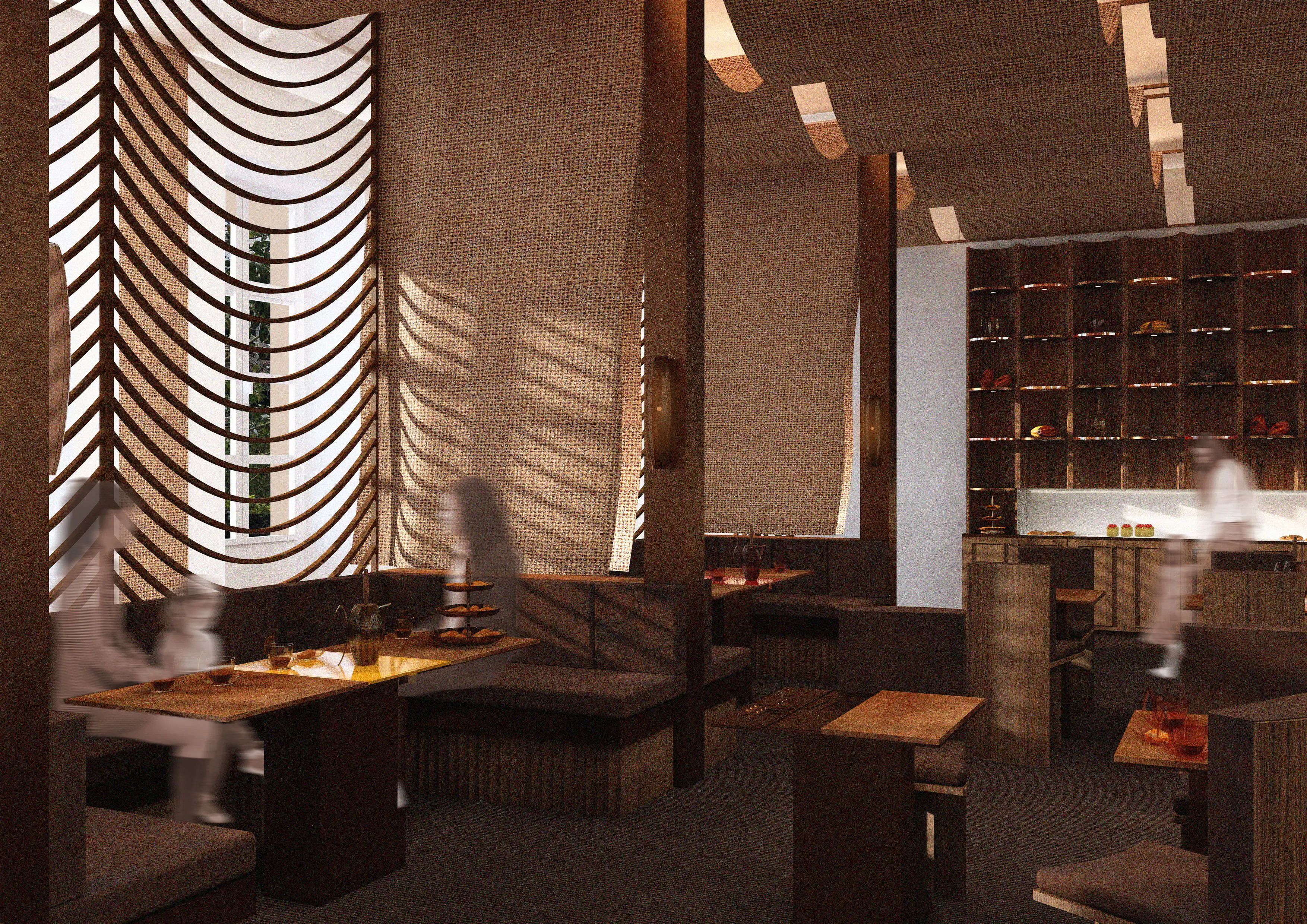 Voilages en toile de jute, claustras en bois de châtaignier, délimitation de l’espace par une succession de poteaux, les visiteurs plongent dans l’univers du bateau et dans les nuances de couleur chocolat.