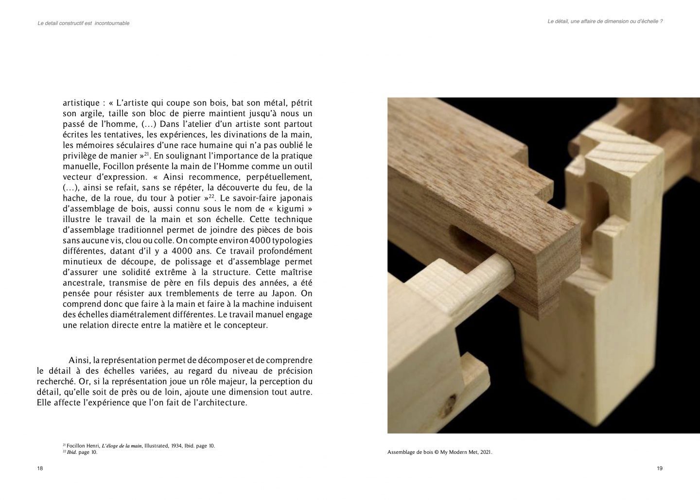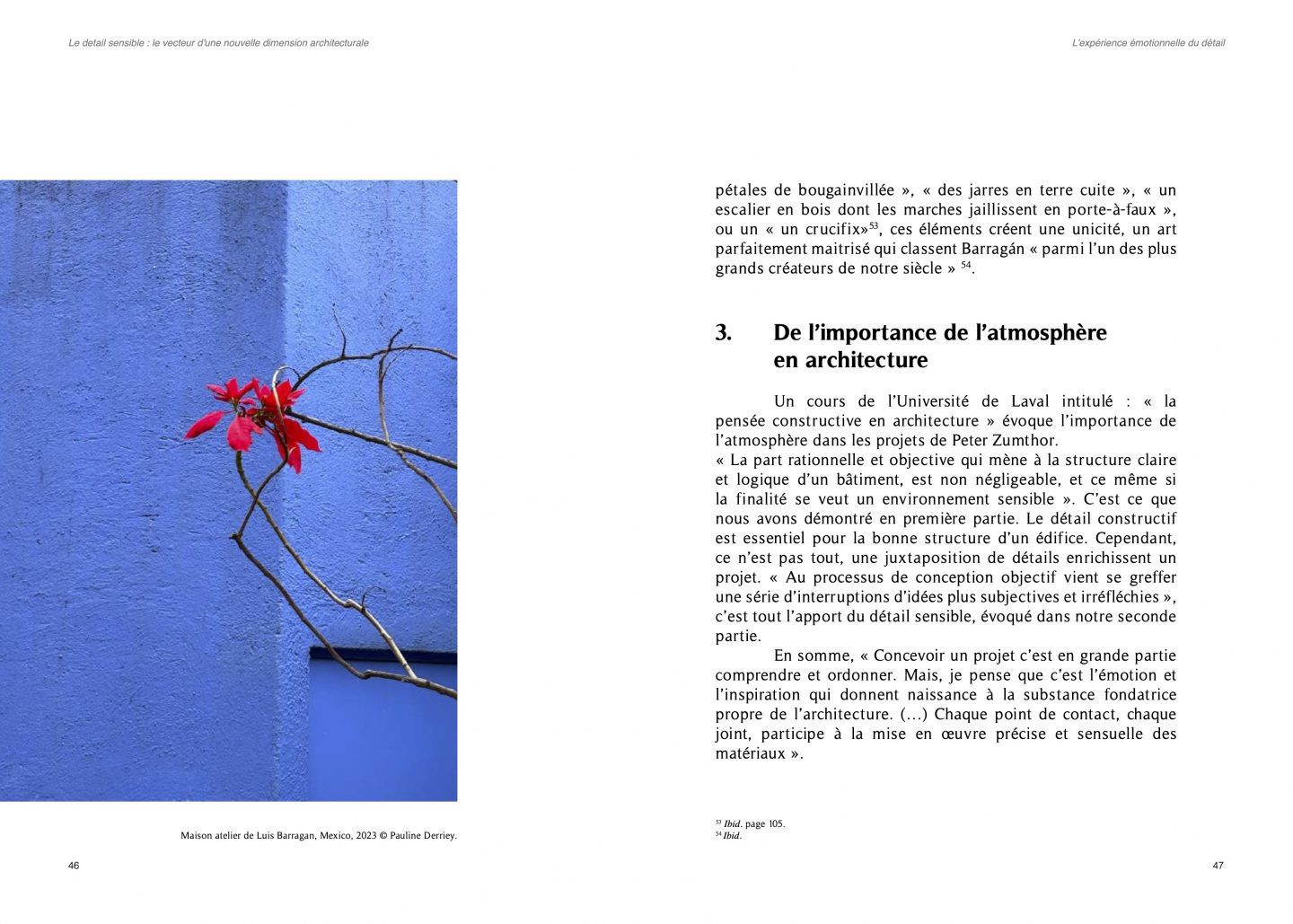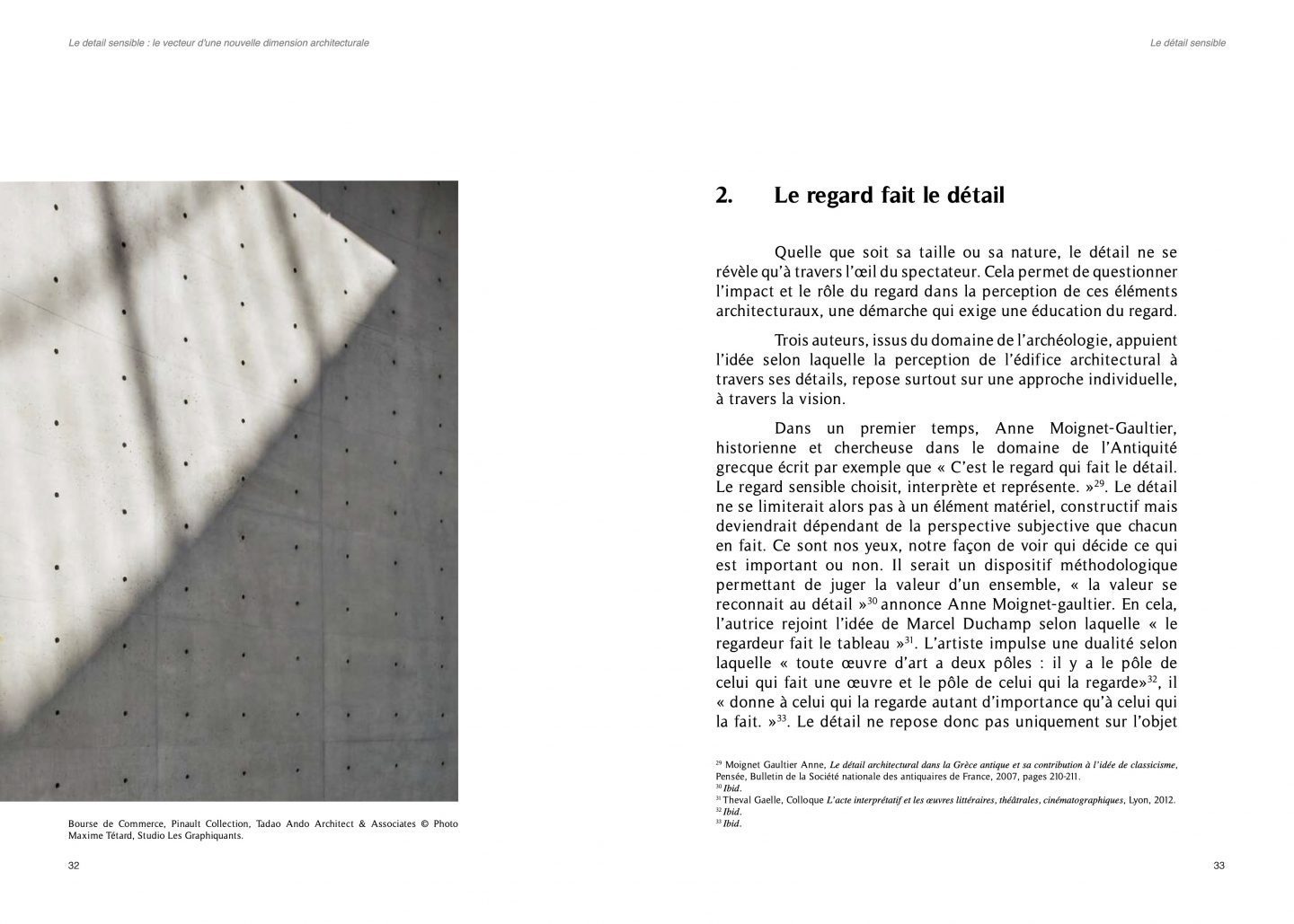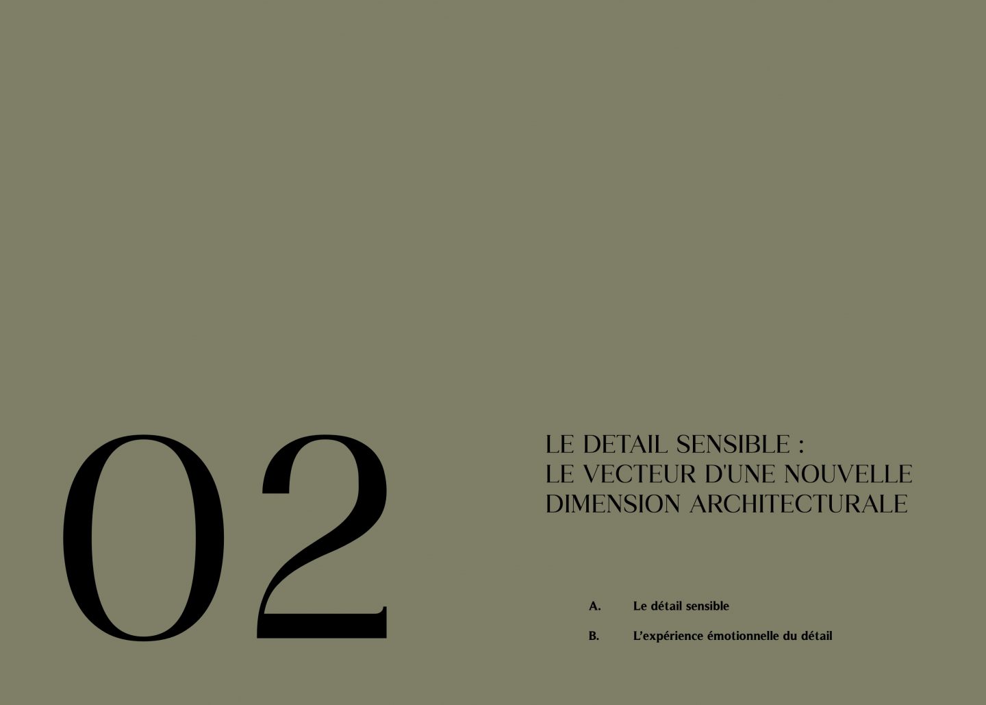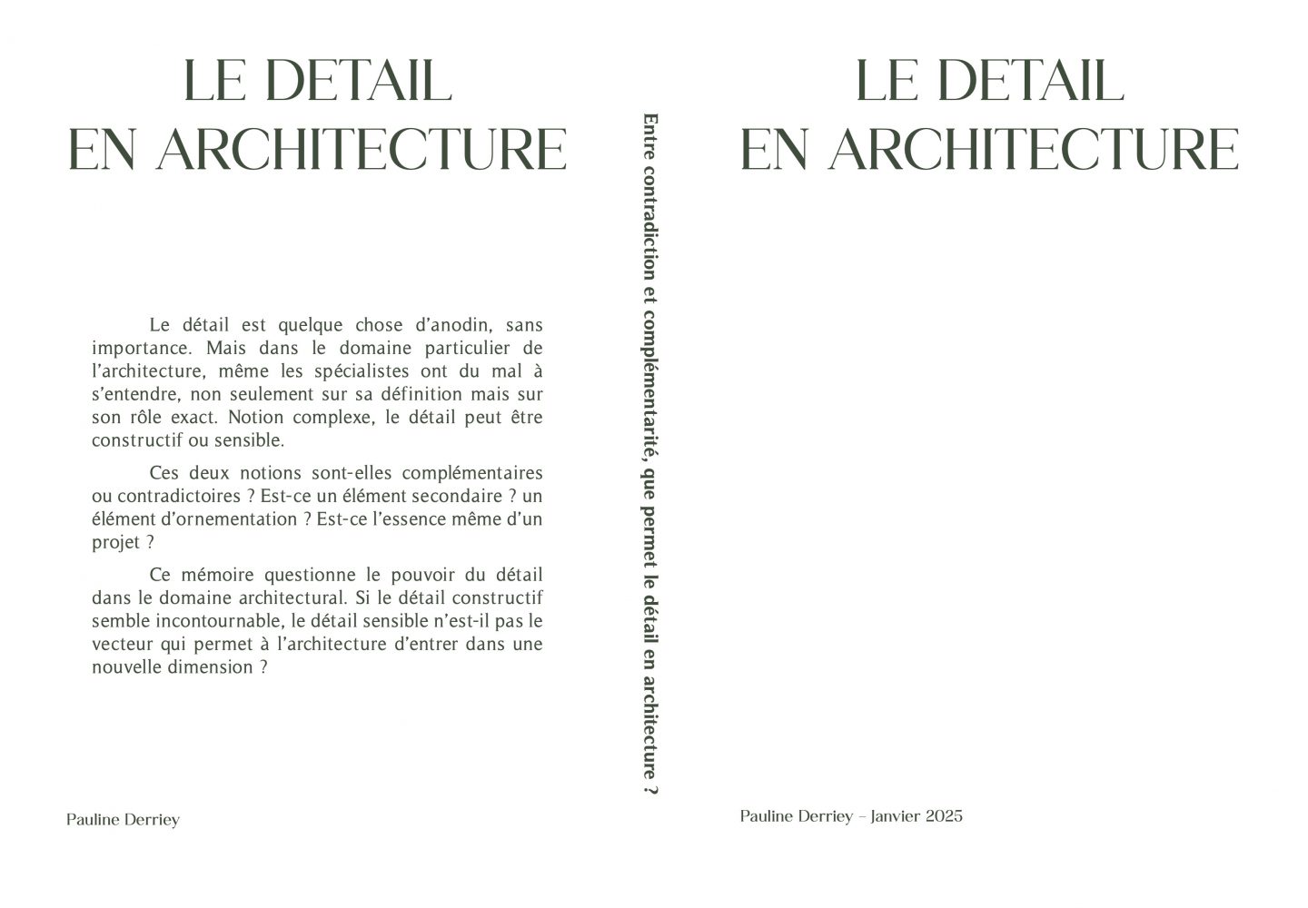 Ce mémoire explore la notion complexe du détail en architecture, tantôt perçu comme un élément anodin, sans importance, tantôt comme vecteur d’émotions. Bien qu’aucune définition universelle ne fournisse de définition claire du détail en architecture, il oscille entre deux pôles : le détail « constructif », nécessaire à la construction d’un bâtiment et le détail « sensible », porteur de sens, d’émotions.