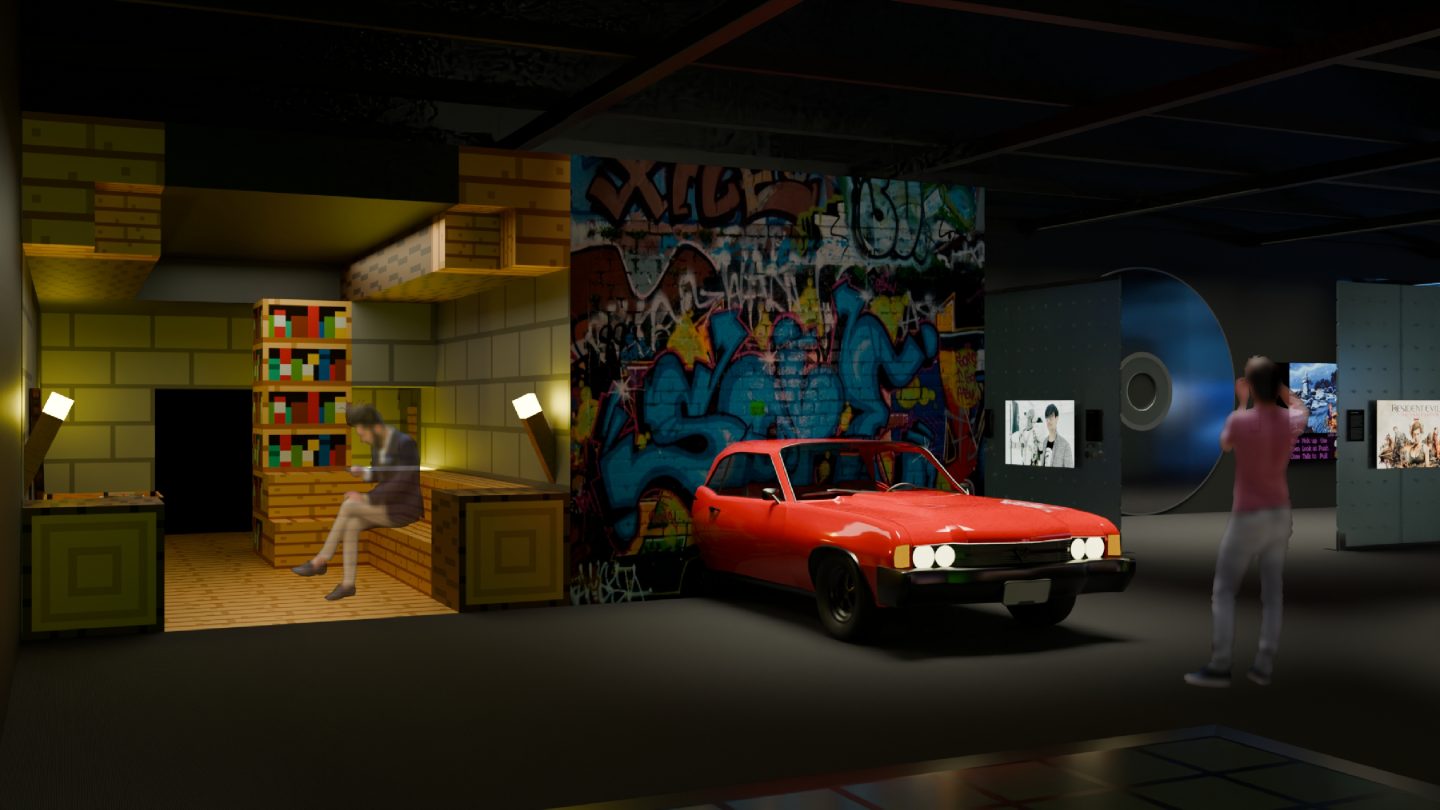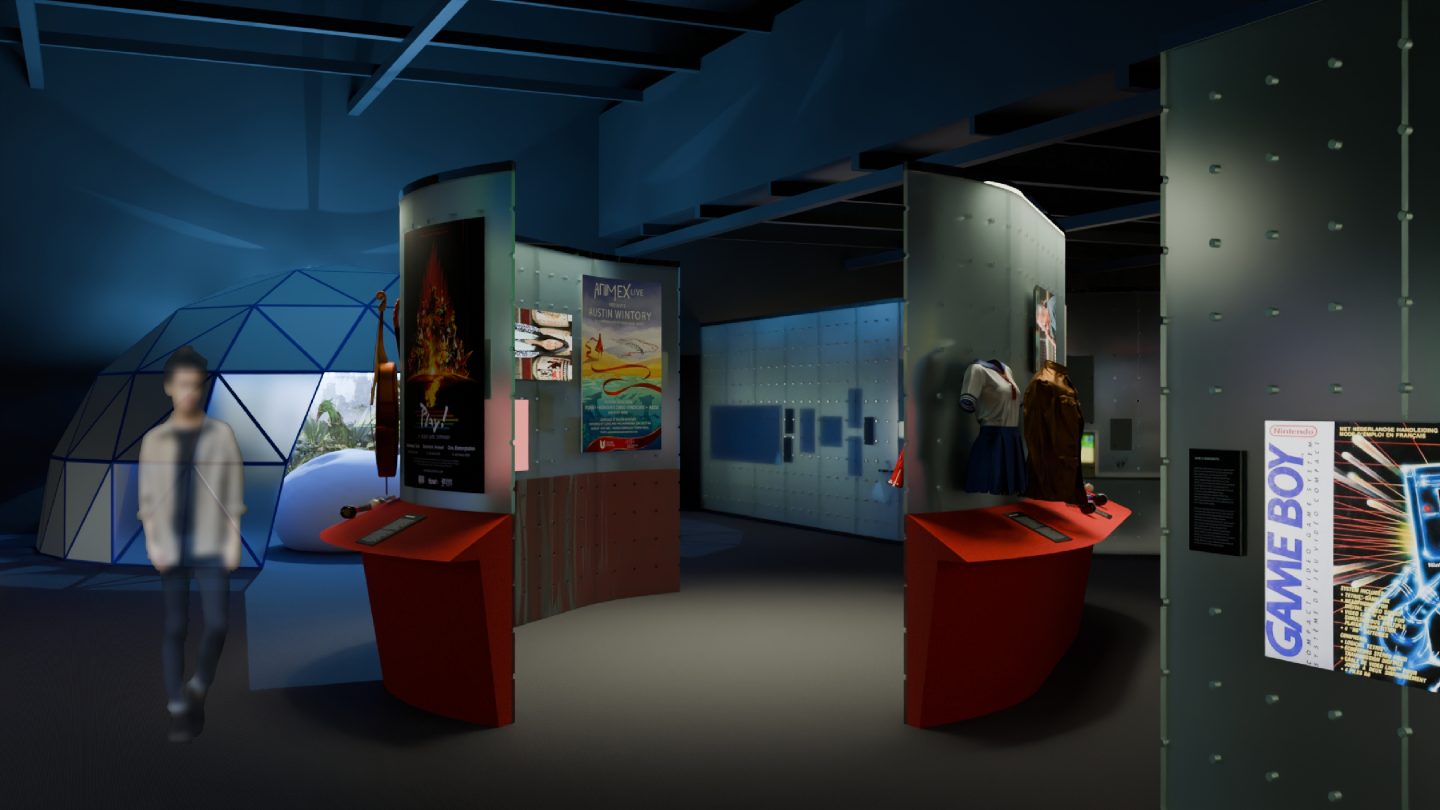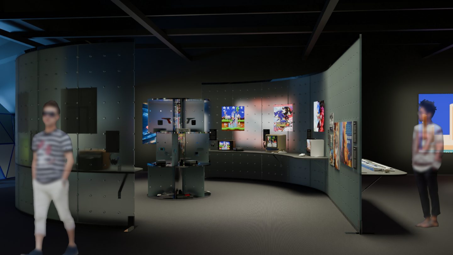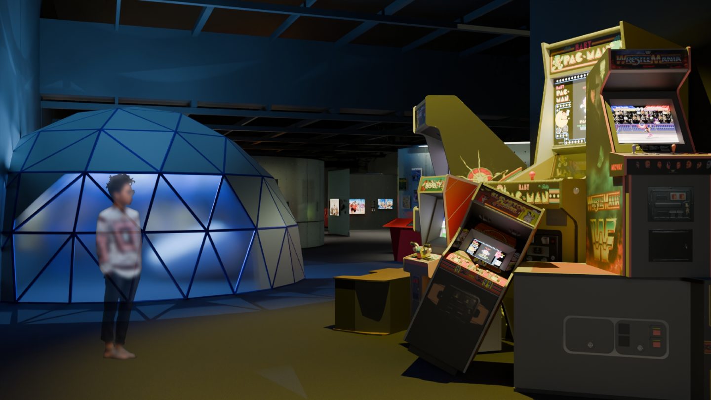 L’ilôt Arcade est composé d’une pile de bornes iconiques, reproduites à différentes échelles démeusurées, pour replonger les visiteurs adultes dans leur corps d’enfant.