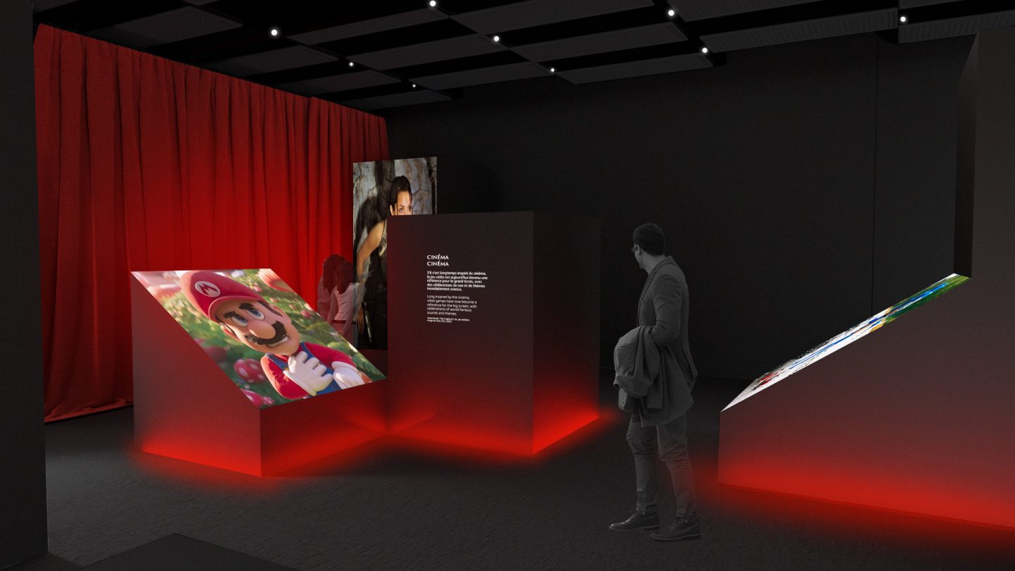 Inspirés des jeux de course, des rampes aux flèches lumineuses mouvantes évoquent le passage de la musique de jeux vidéos au niveau supérieur, en offrant une transition immersive entre les sections de l’exposition.