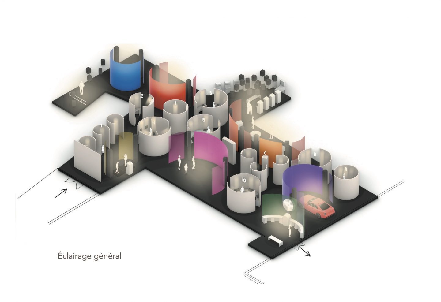Chaque visiteur peut se repérer dans l’exposition et passer dans chaque univers grâce à un plan guidé qui indique les îlots individuels par des numéros suspendus et par des couleurs pour les îlots collectifs.