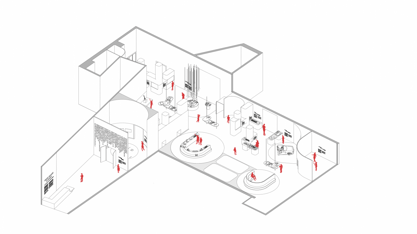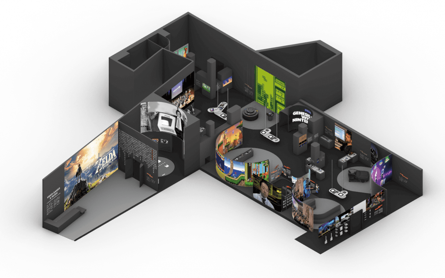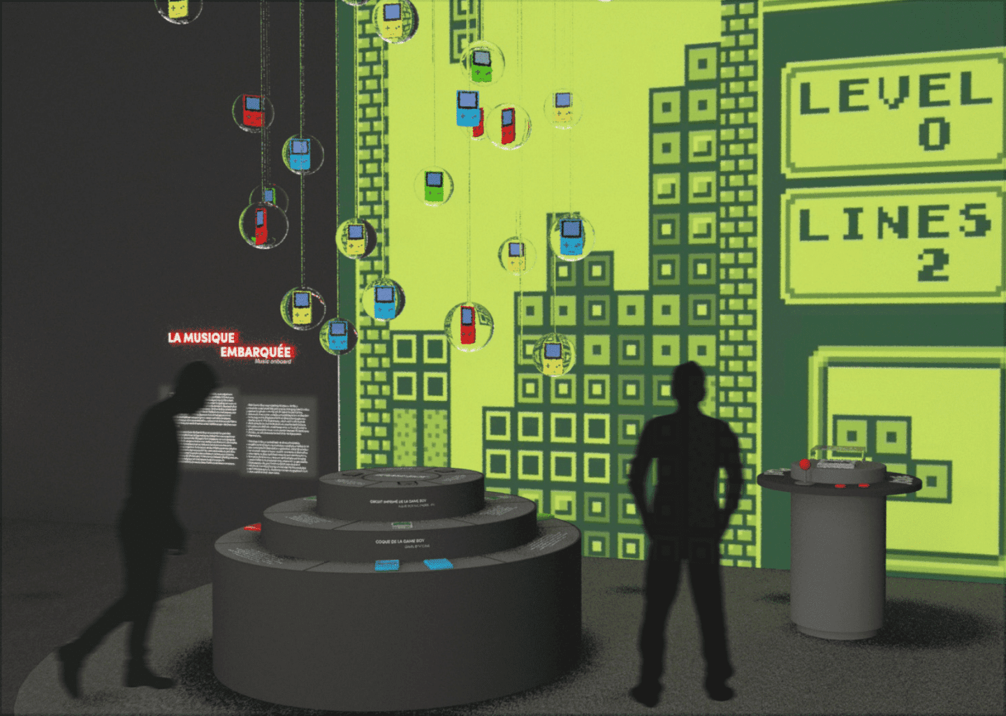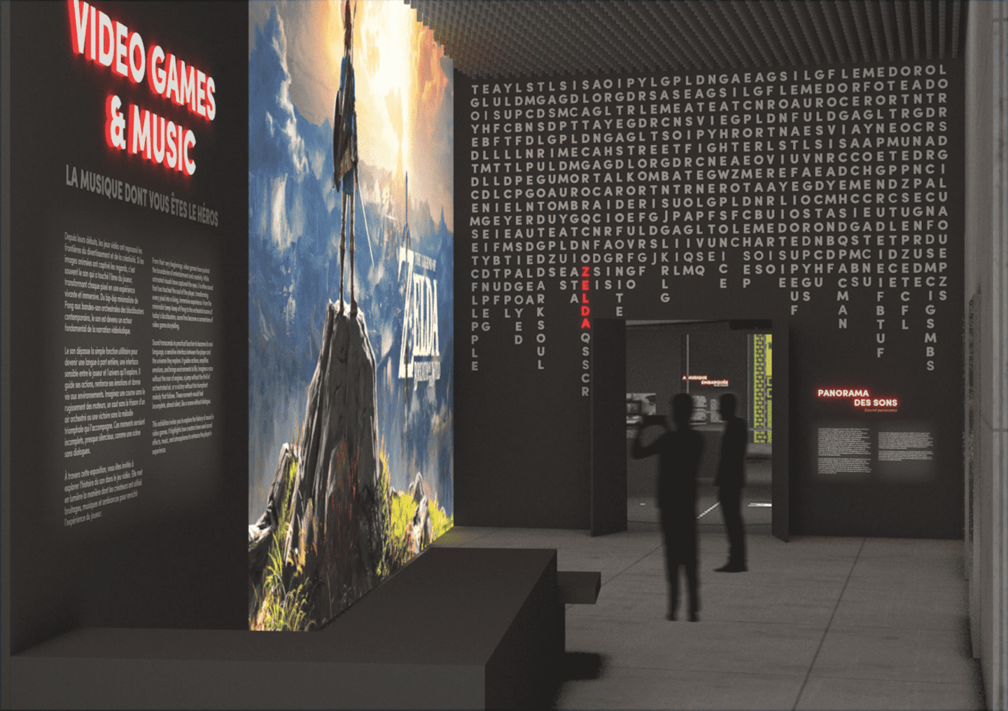 La scénographie, inspirée des salles hypostyles, traduit l’immensité du monde ouvert des jeux vidéo