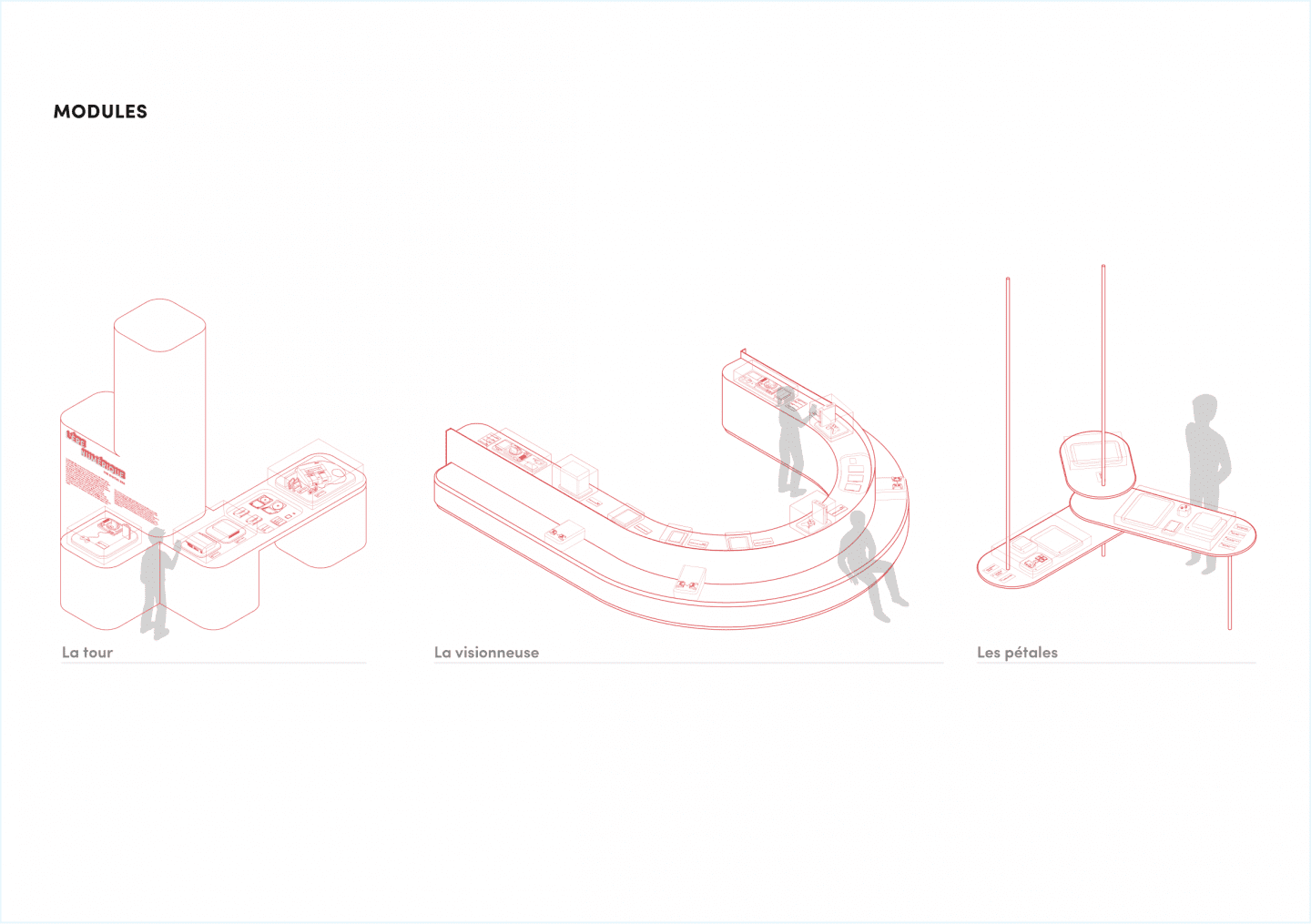 et orientent le visiteur dans l’atmosphère tamisée de la Philharmonie de Paris.