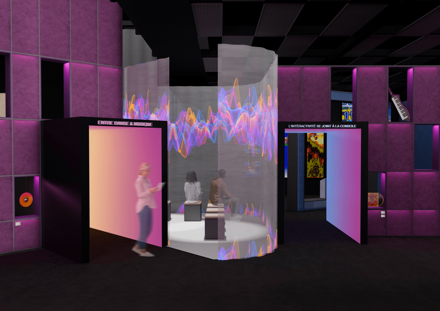 L’espace central fait lien entre les 3 thèmes. Une pause pour le visiteur, au centre d’ondes d’une musique projetées sur un rideau.