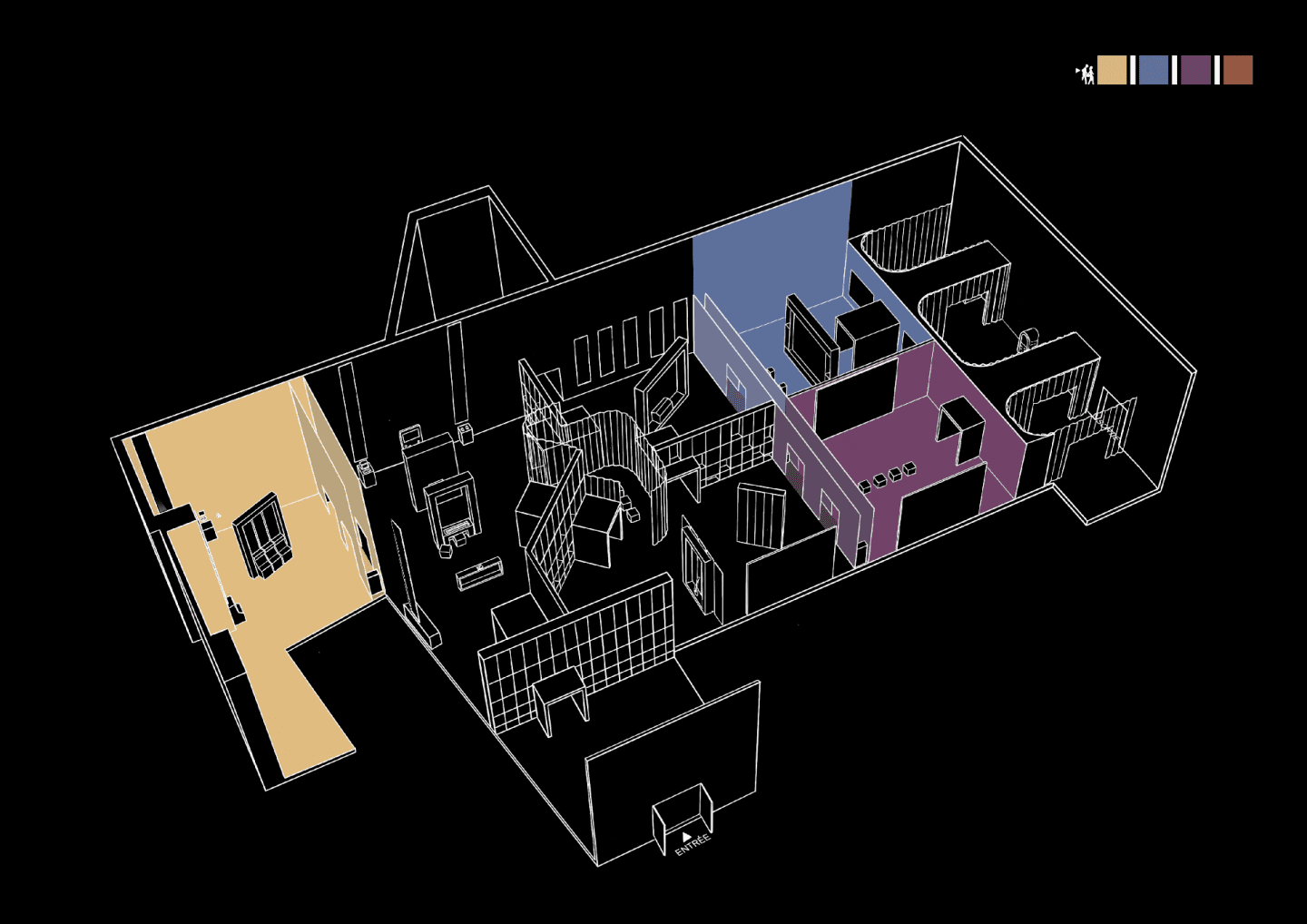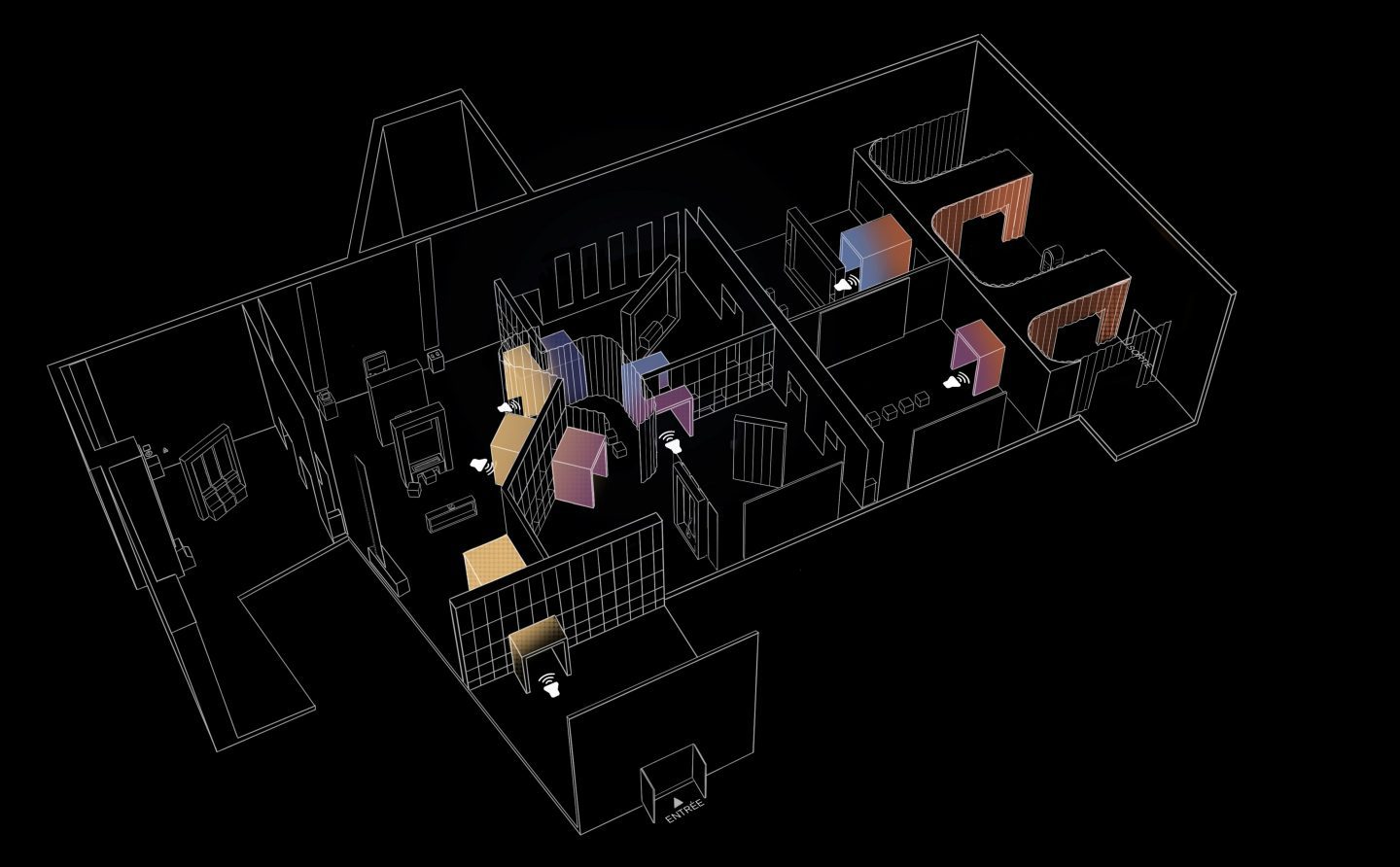 Des transitions sonores interactives donnent aux visiteurs des indices sur le thème qu’ils s’apprêtent à découvrir.
