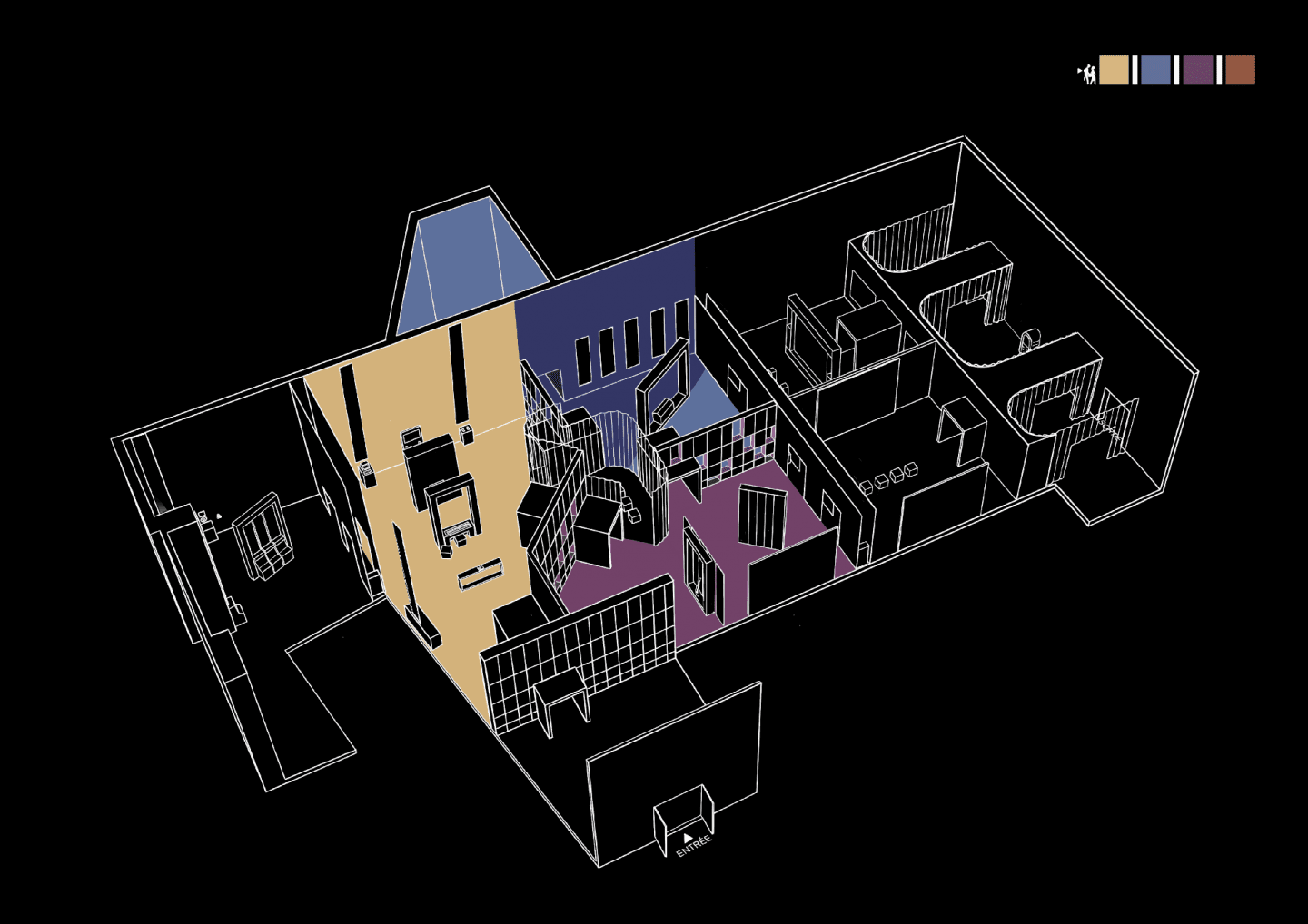 L’espace central fait le lien entre les trois thèmes. Le visiteur peut faire une pause entouré des ondes d’une musique de jeux vidéo, projetées sur un rideau.