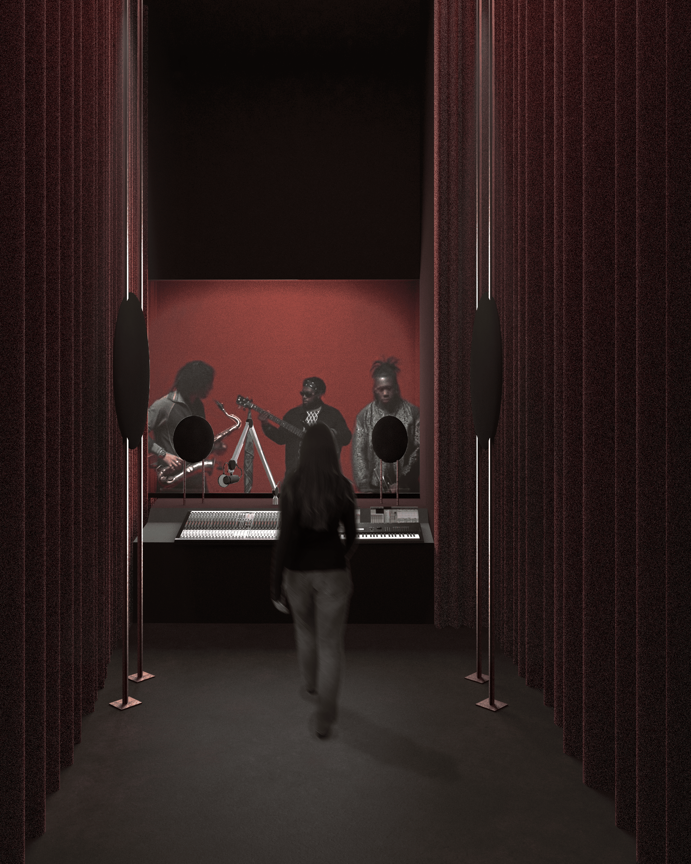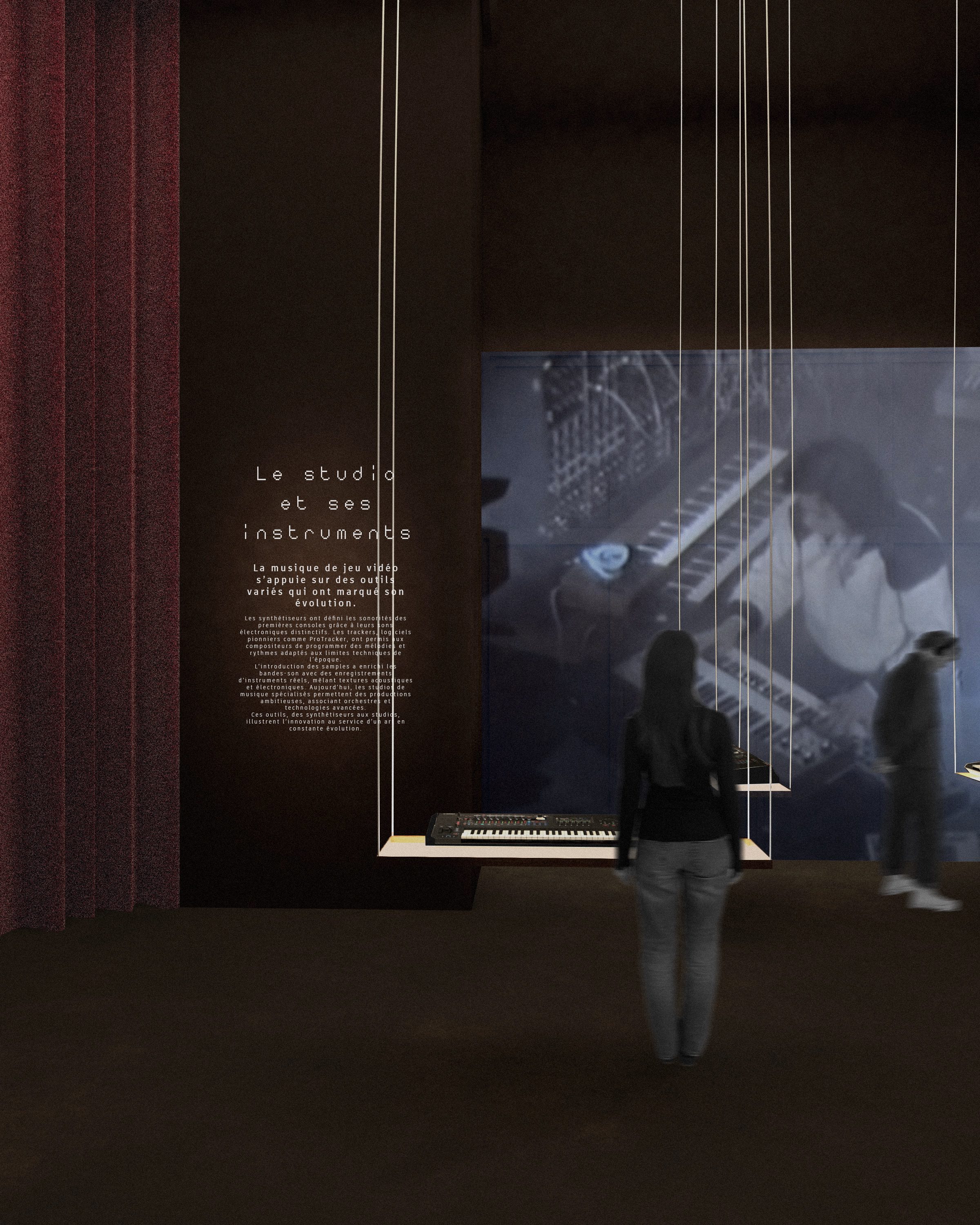 L’écran, support du jeu vidéo, devient la principale source lumineuse. Et quant au son, sujet de l’exposition, il est abordé de deux manières différentes : seul avec un casque ou en multijoueur avec un son libéré.