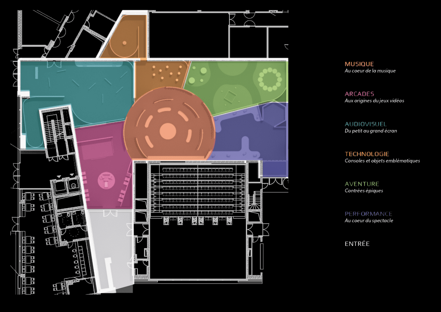 Au-delà des rideaux tombent les notes : un hub musical bat au cœur du parcours. Carrefour incontournable, il distribue les quatre univers thématiques. Pour avancer, chacun doit franchir à nouveau ces voiles sonores, rappel constant du rôle axial de la musique.