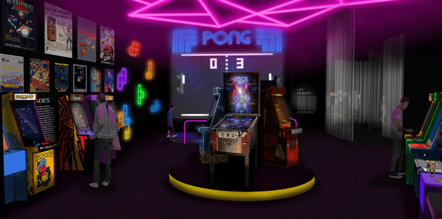 Le visiteur débouche aussitôt dans l’espace Arcade : un plongeon dans les origines vidéoludiques. Tubes néon, flashs colorés et nappes sonores saturent la pièce, offrant aux curieux la découverte d’une époque pionnière et aux nostalgiques la joie de la revivre.