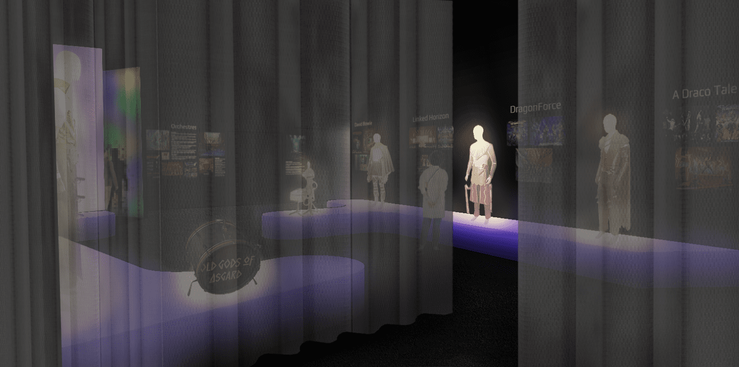 Dans le hub, la musique centrale enveloppe le visiteur. Les rideaux translucides laissent entrevoir les cinq univers, mais leurs bandes-sons restent étouffées. Ce n’est qu’au moment de franchir l’épaisseur textile que leurs sonorités se mêlent.