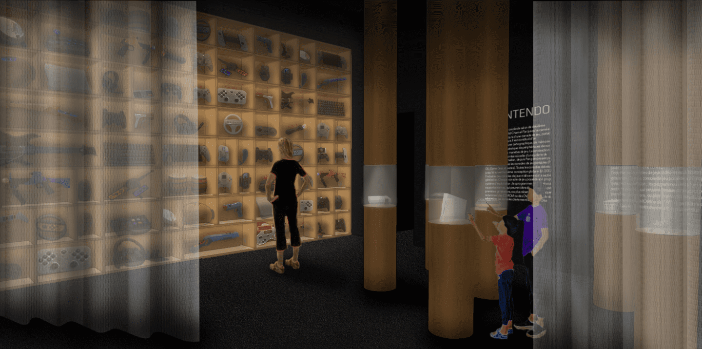 À l’entrée, de hautes étagères évoquent un game-store : des centaines de jaquettes y forment un mur coloré dans lequel on se perd. Certaines cachent des pads interactifs ; une pression déclenche aussitôt un motif sonore emblématique, plongeant le visiteur dans la mémoire collective du jeu.