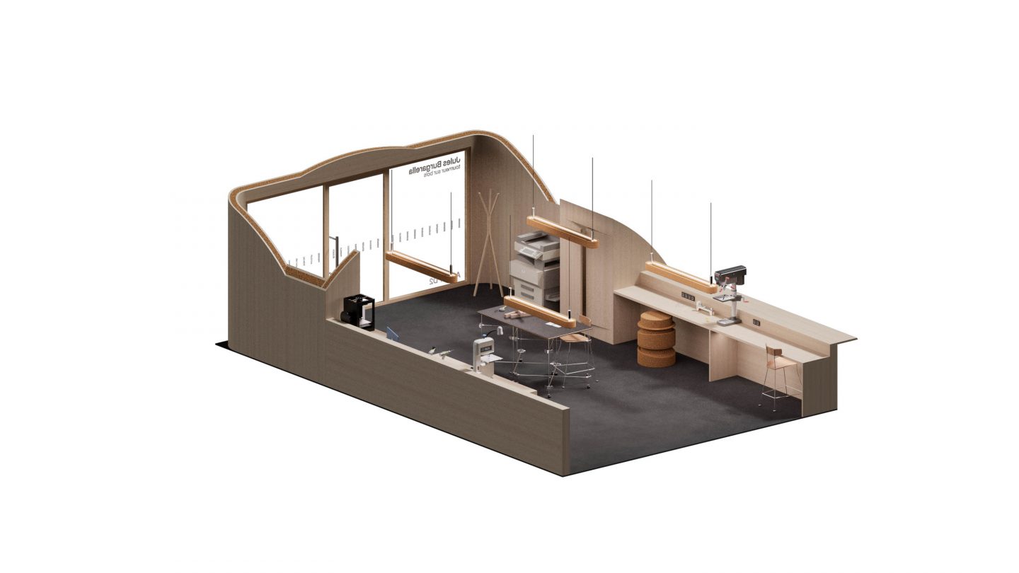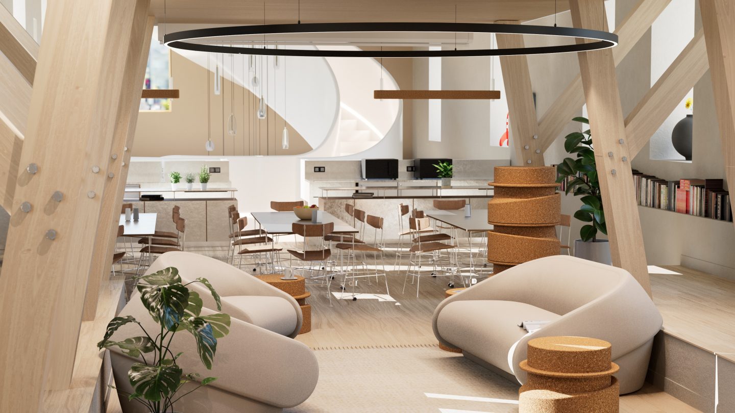 Le tabouret Totem est un objet polyvalent en liège servant d’assise ou de table basse. Empilable, il devient une colonne évoquant les totems, symboles de collectivité. Léger, chaleureux et fonctionnel, il s’adapte à tous les espaces. Il est ici utile dans l’espace détente, surtout une fois transformé en espace conférence.