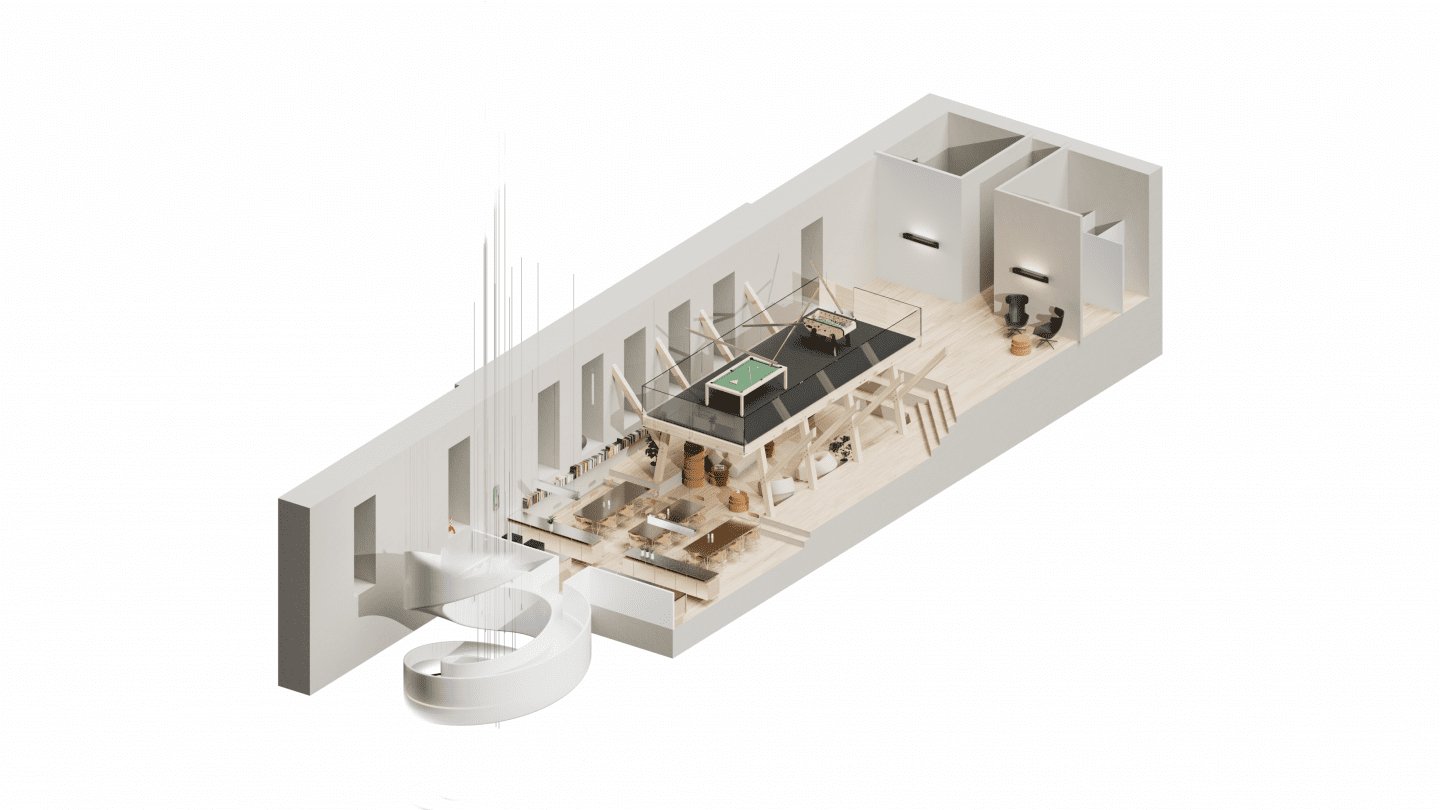 Conçu pour la modularité, l’espace rencontre regroupe cuisine partagée, salle à manger, salon et mezzanine / salle de jeux. Le salon, assombri sous la mezzanine, se transforme en amphithéâtre. Les tables modulaires, l’ouverture spatiale et l’usage pensé pour l’évolutivité favorisent les échanges et la convivialité.
