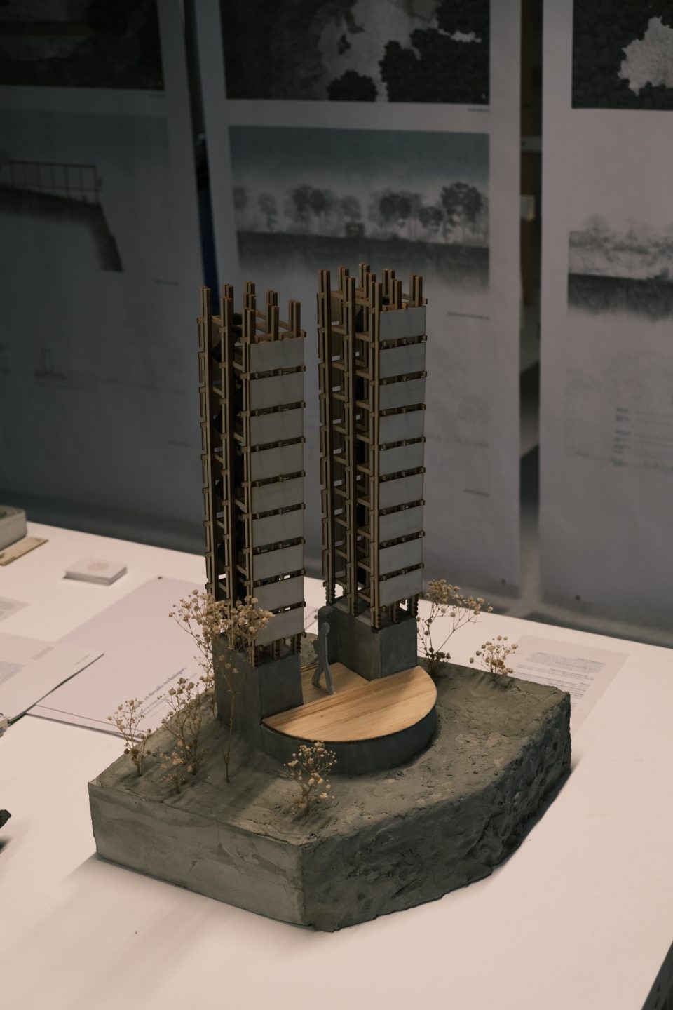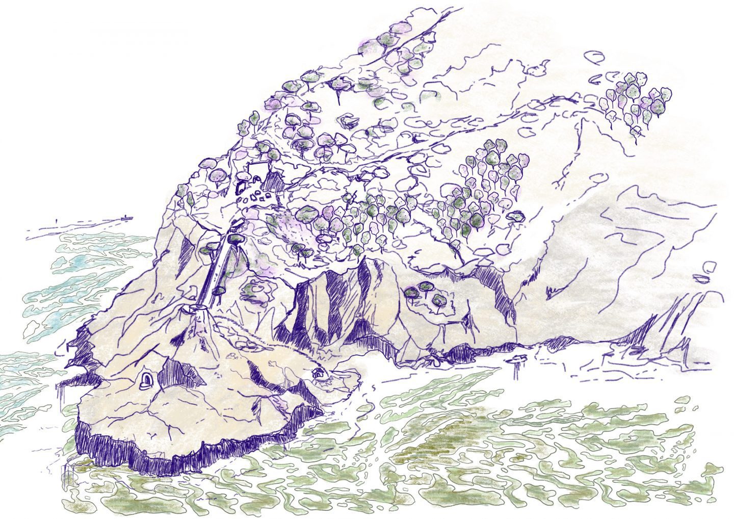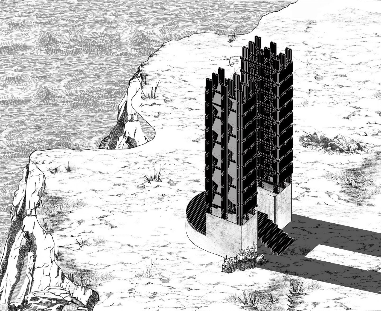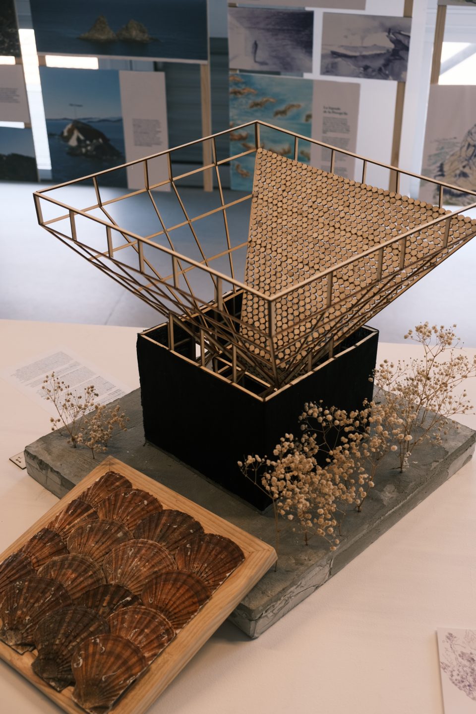 Deux grands blocs cadrent la vue sur l’Île Longue depuis une ruine militaire. Inspirée d’un mythe et d’un geste d’enfance, la structure en cyprès et lin noir joue avec l’ombre, le vent, les sons. On y grimpe, on s’y pose. Un abri suspendu, entre lumière et silence, qui invite à contempler et ressentir.