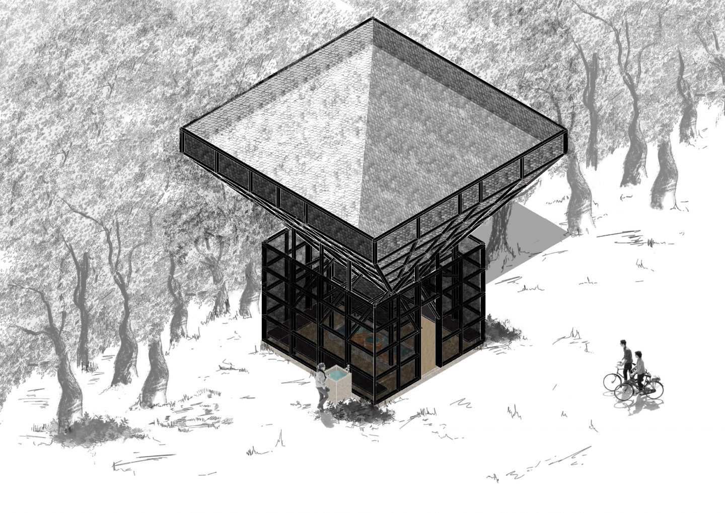 Une citerne dissimulé sous les pins recueille l’eau de pluie, filtrée et guidée vers des jarres enterrées. Inspirée d’un atrium romain et de mains jointes, sa forme capte la lumière, raconte l’eau, sa lenteur et son écoulement. Coquilles, lin et bois composent ce refuge sensoriel, entre ombre, lumière et partage.