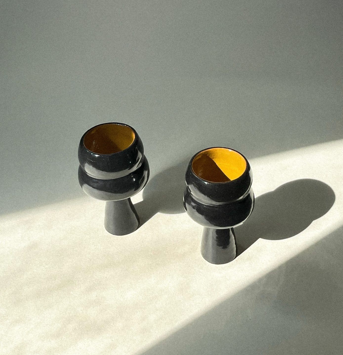 Pour mes objets, j’ai choisi des émaux contrastant avec une surface noire à l’extérieur et à l’intérieur des engobes colorées. Ces couleurs sont un clin d’œil à la fresque dans laquelle on y retrouve les mêmes pigments.