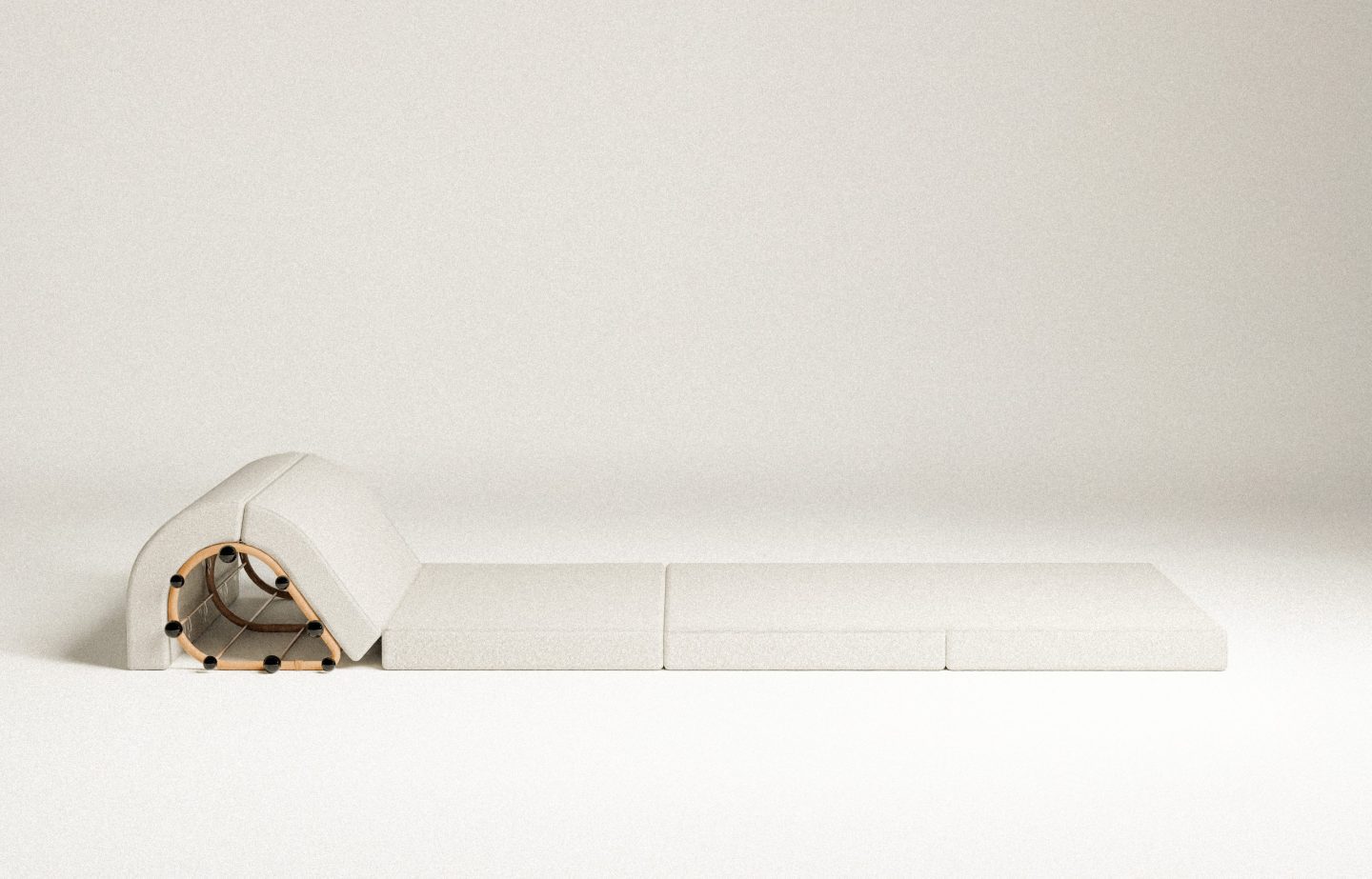 Le lit de banquet est directement inspiré de la posture du banquet romain. J’ai repris cette typologie en imaginant un futon recouvert de laine bouclée, un tissu texturé qui joue avec la sensorialité. Puis, une structure indépendante en rotin cintré ponctuée de sphères en céramique qui vient créer un dossier.