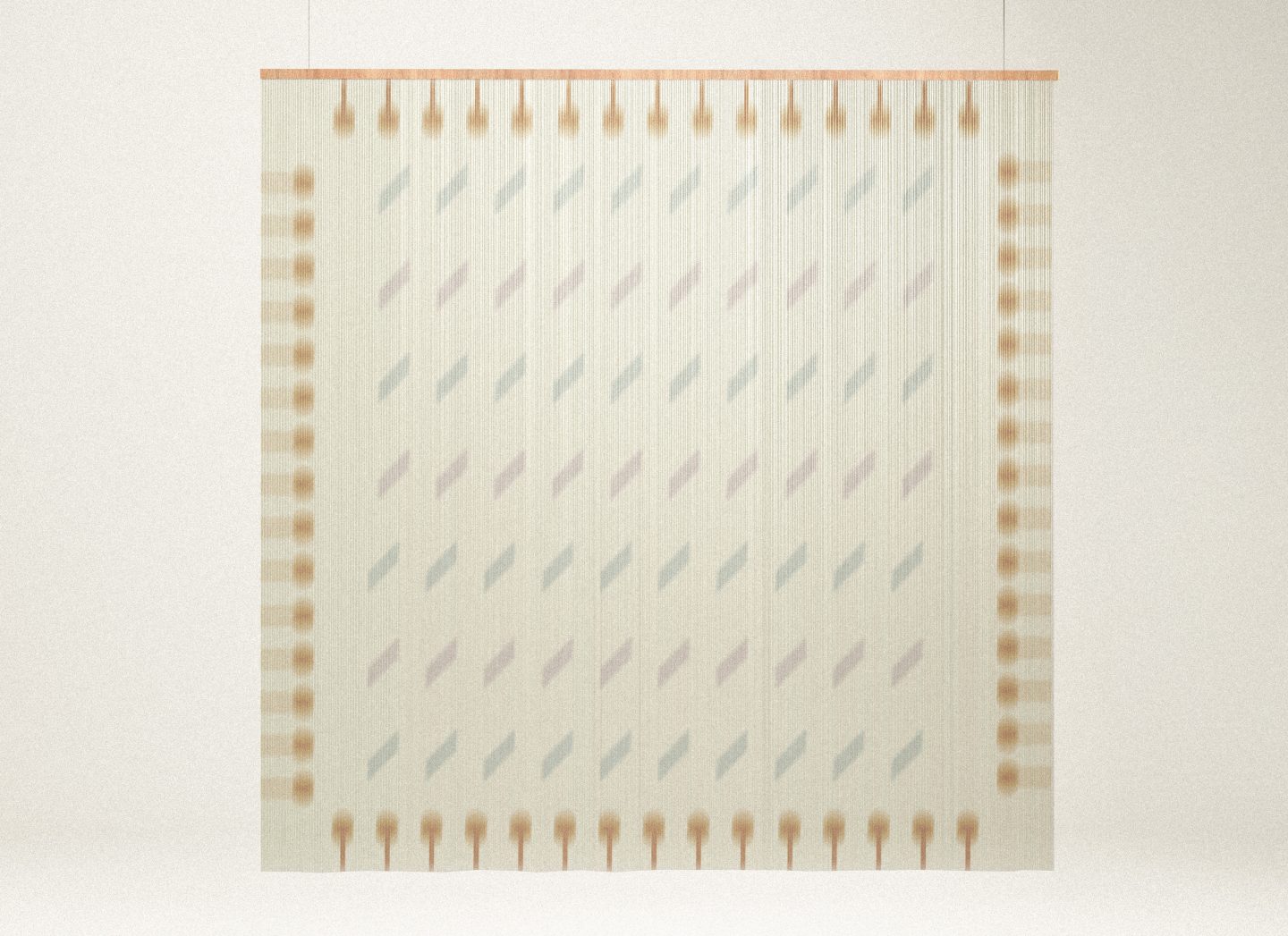 Le rideau en fils de laine sert de séparateur d’espace. Il structure la scène comme le tissu suspendu dans la fresque. Il reprend le motif que l’on y peut apercevoir. Chaque fil est teint à la main et en les assemblant on voit le motif apparaître dans la masse, comme un souvenir du dessin original.