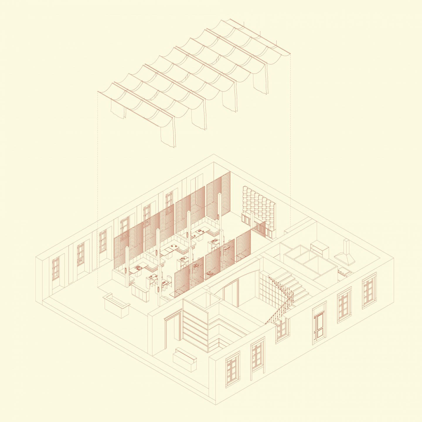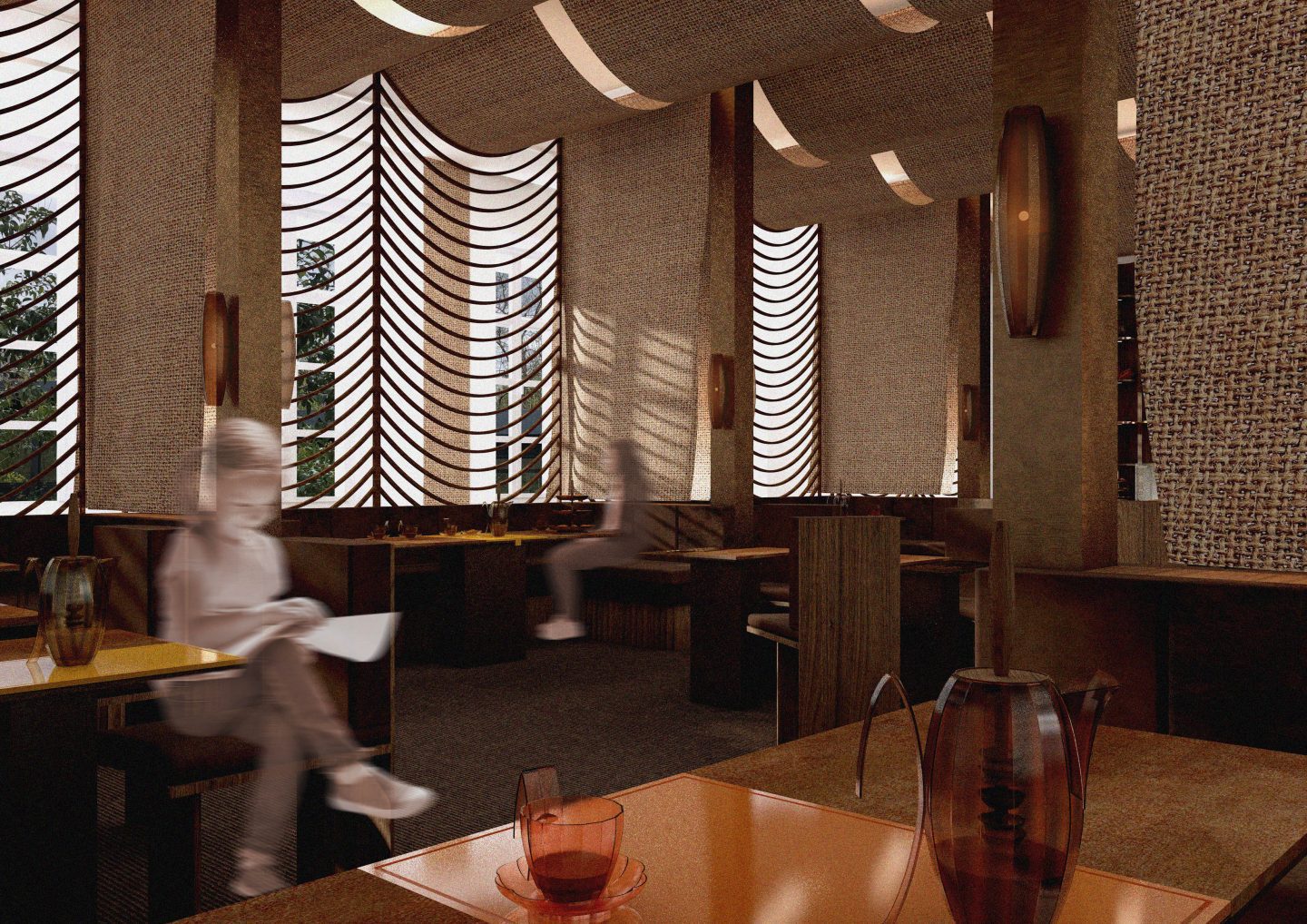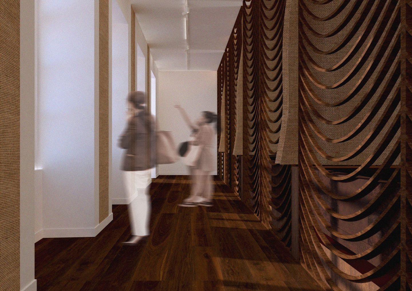 Voilages en toile de jute, claustras en bois de châtaignier, délimitation de l’espace par une succession de poteaux, les visiteurs plongent dans l’univers du bateau et dans les nuances de couleur chocolat.