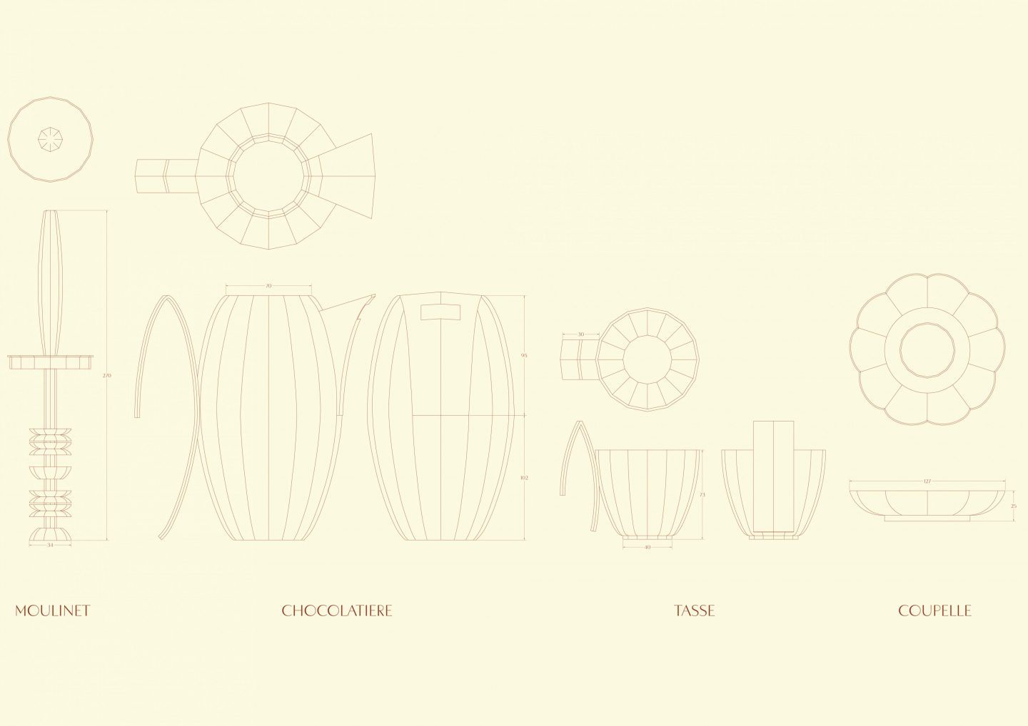 Le rituel du chocolat chaud s’articule autour d’un objet mythique, tombé dans l’oubli au fil des années : la chocolatière. Elle permet, grâce à son moulinet, de continuer à faire mousser le chocolat une fois sorti du feu, jusqu’à ce qu’il soit servi à table. Le service est accompagné de tasses et coupelles, de même qu’un plateau laqué.