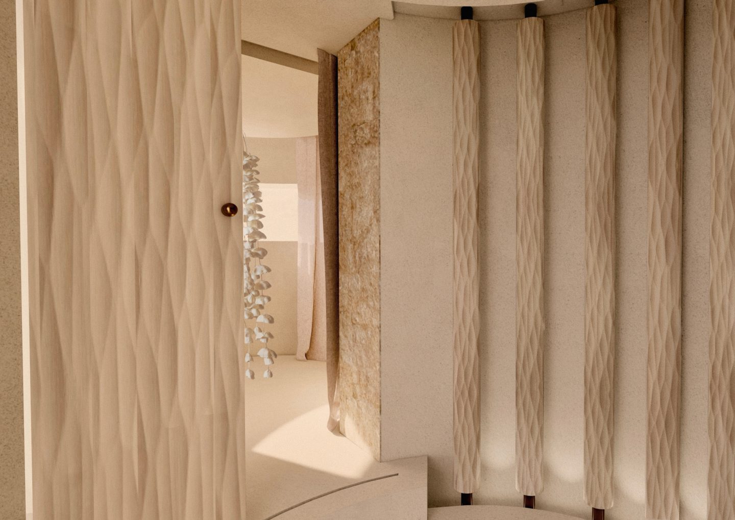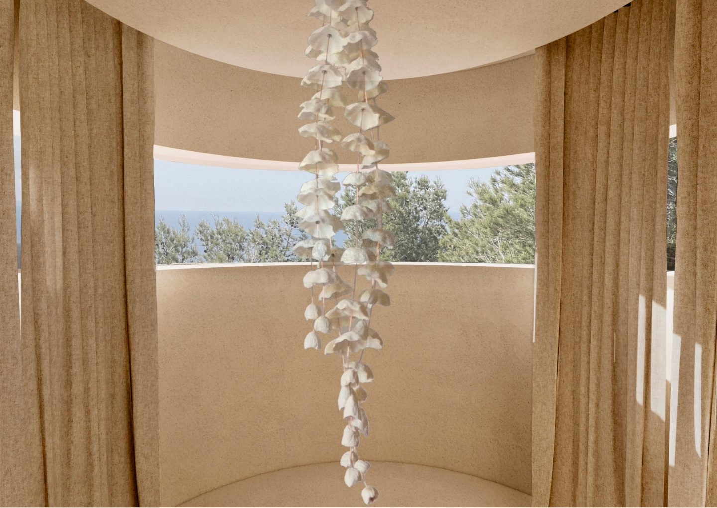 D’abord, une alcôve ronde et discrète, où patientent de petits moulins en bois clair. Sous la main, ils tournent lentement, dénouant les tensions dans un geste apaisant. Plus loin, une pièce plus légère encore : un carillon suspendu résonne au moindre souffle. Autour, des voiles ondulent doucement. L’air, le son, le silence, l’essentielle
