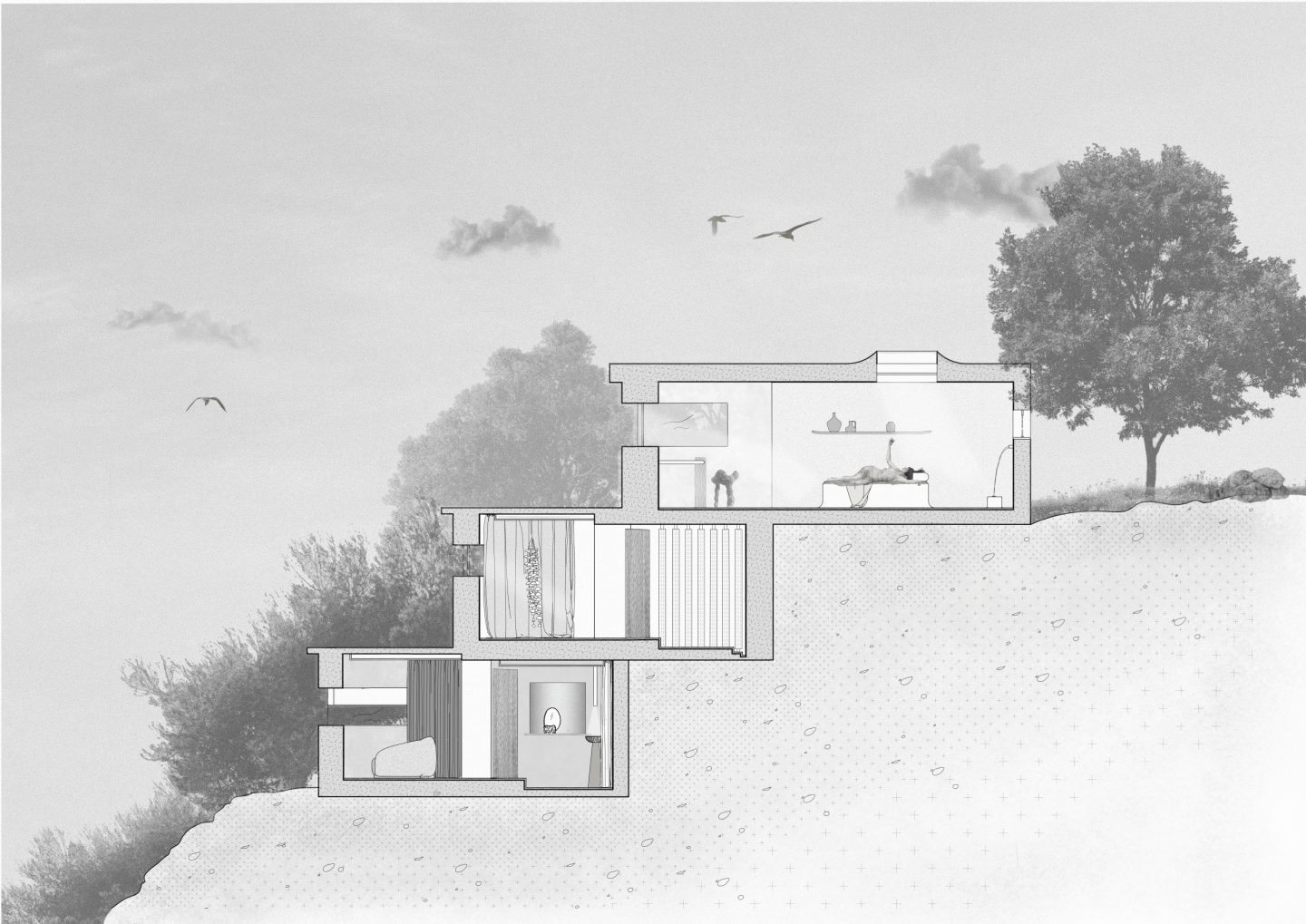 D’abord, un vestiaire discret invite à se délester : déposer ce qui encombre, avant d’entrer dans l’intime. Face à la mer, un bureau attend l’écriture un lieu pour confier au papier ce qui ne peut rester en soi. Au centre, la méridienne tend ses lignes douces. On s’y allonge pour lire, découvrir des mots anonymes laissés par d’autres.
