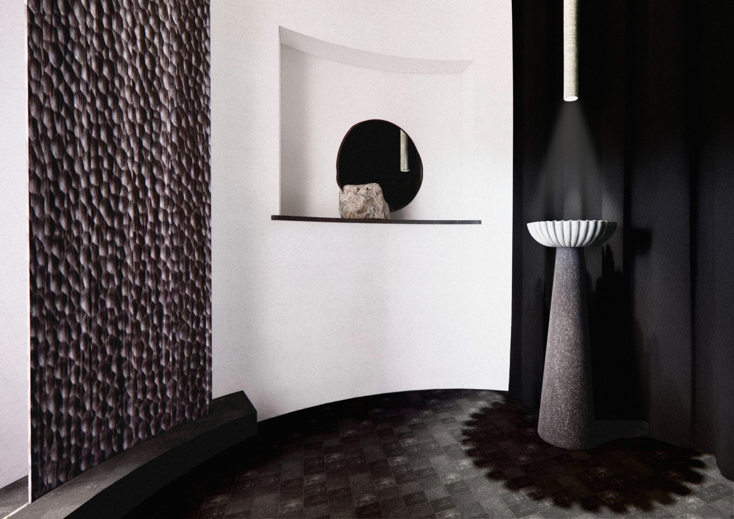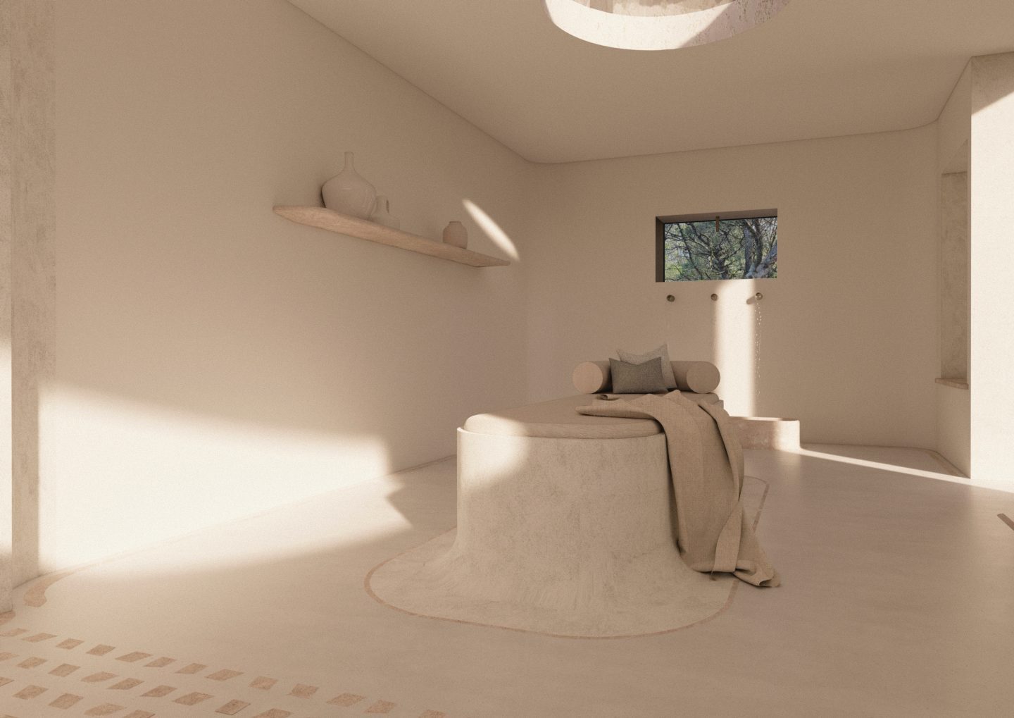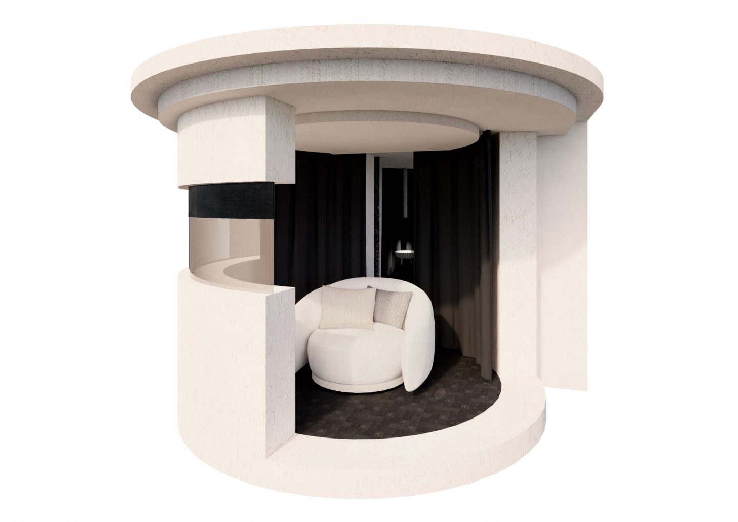 Tout se resserre, s’obscurcit, se dépouille. Le corps touche à l’essentiel. Un bassin, un miroir, une transition. La matière devient lourde : pierre, bois noir, voiles sombres. Au bout, une pièce ronde, un fauteuil face à l’horizon. Silence. Souffle. Être. Le dernier seuil : une rencontre intime.