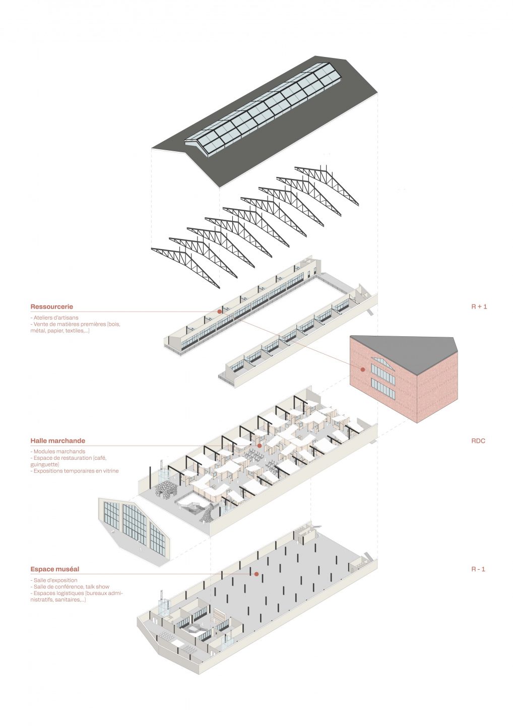 L’architecture proposée repose sur une structure poteaux-poutres métalliques qui libère le centre pour un espace polyvalent, modulable et donc réversible. La verrière zénithale, quant à elle, inonde l’intérieur de lumière et crée un effet « dedans-dehors », donnant l’illusion d’être à l’extérieur.