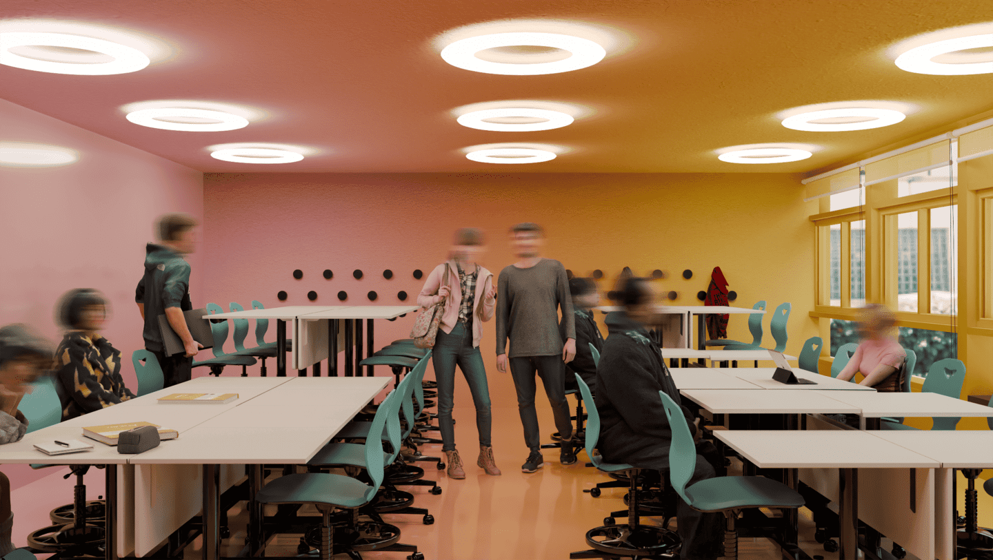 Là encore le regard sur le monde extérieur s’installe dans la classe. Ce regard se traduit par la matérialisation de l’entrée de la lumière dans la salle de classe. Cette matérialisation se fait à l’aide de dégradés qui vont du jaune du soleil à une autre couleur.