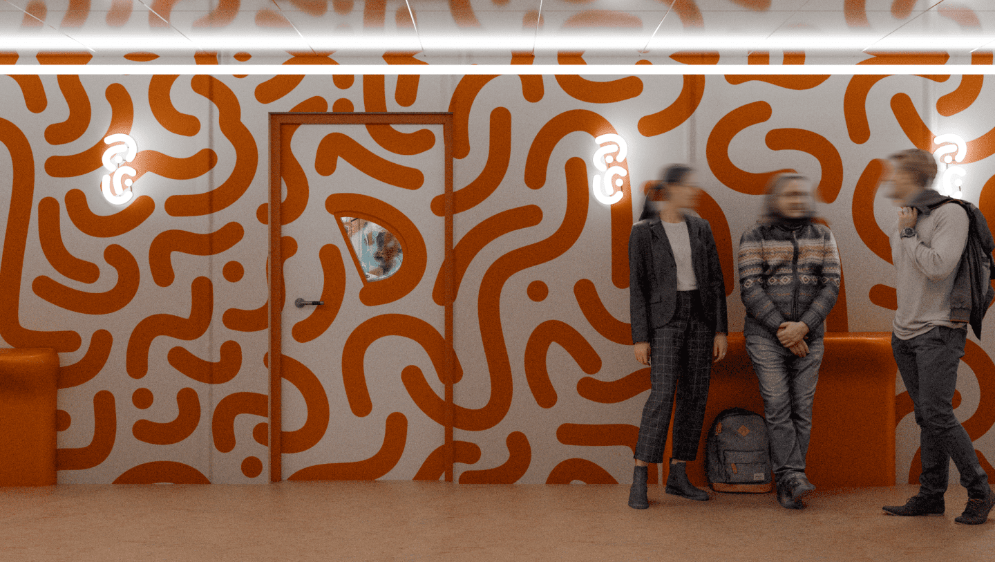 J’ai dessiné les assis-debout de 2 tailles différentes. Un à 74 cm et un autre a 84 cm. En effet au lycée les élèves ont des tailles qui peuvent être très variées. Ils peuvent aussi bien faire 1m50 que 2m. Les fresques sont faites en papier peint acoustique. Les motifs dynamiques sont imprimés sur des plaques de bois microperfo