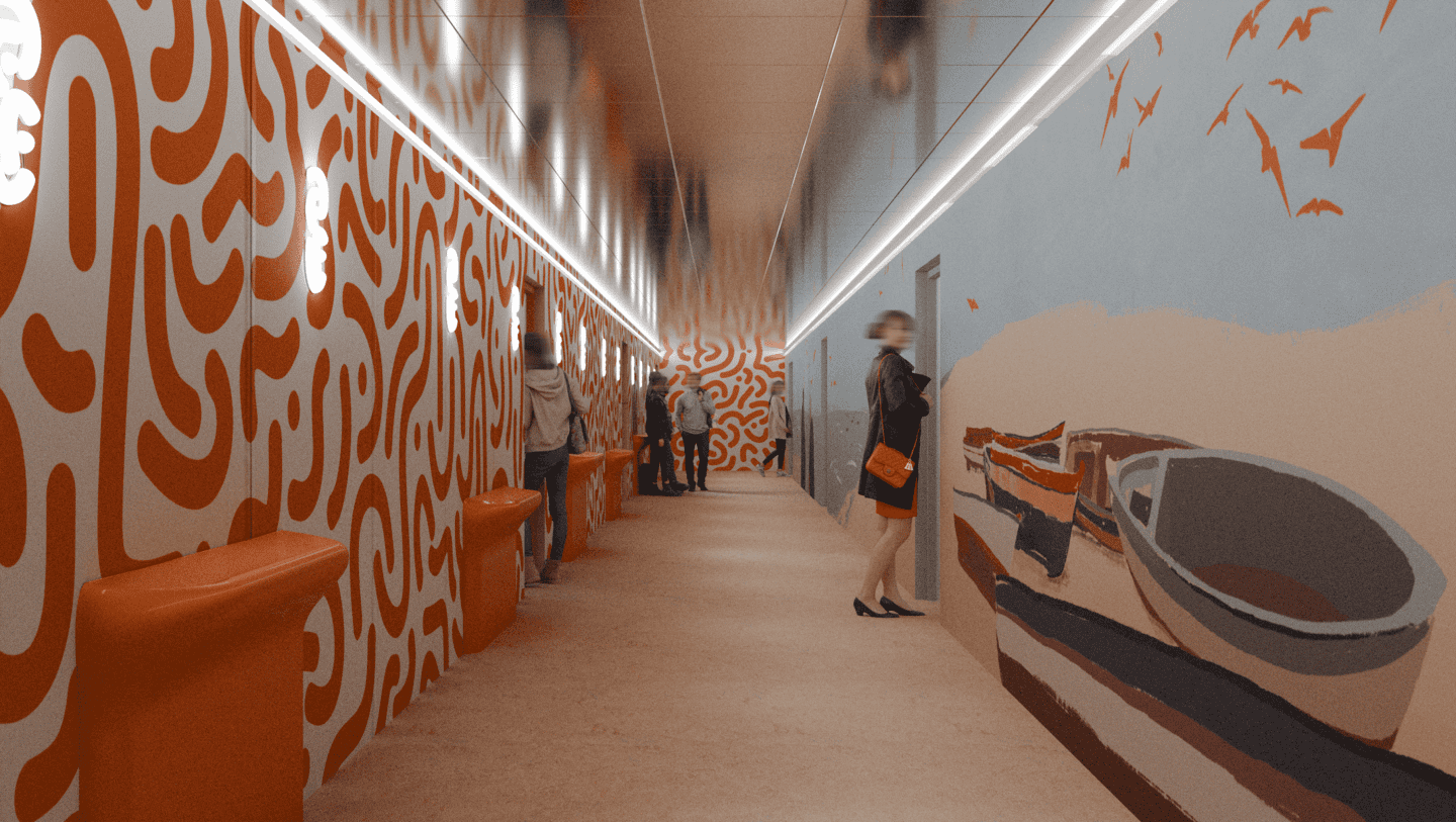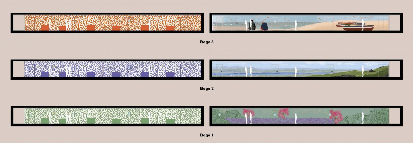 Comme les couloirs n’ont pas de fenêtre, je crée un regard, une ouverture sur le monde extérieur grâce à des fresques de paysages. Pour éviter une possible sensation d’enfermement, les dalles de plafond technique seront achetées laquées pour permettre le reflet du couloir et donc un prolongement des 2m50 de HSFP.