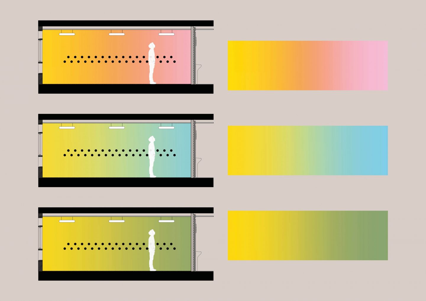 Les couleurs ont sciemment été choisies : le jaune pour son dynamisme, le rose pâle pour ses vertus apaisantes, le bleu pour son impact psychosensoriel favorisant la concentration et le vert qui rappelle la nature et qui a des vertus calmantes.