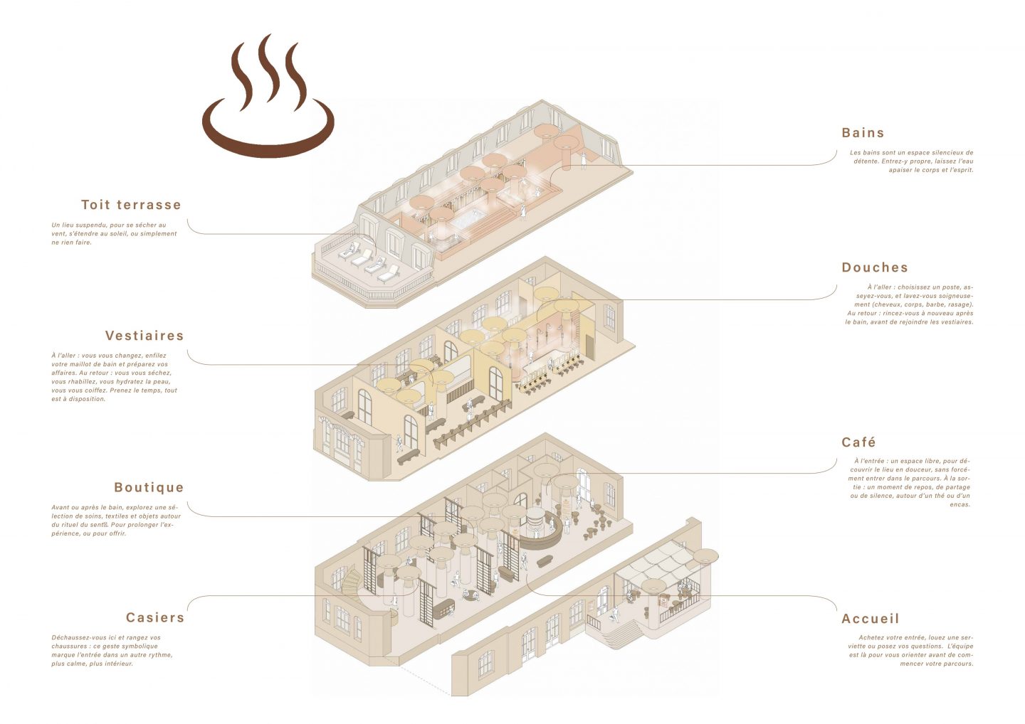 Au rez-de-chaussée, le projet reste connecté à la ville, accessible à tous, même à ceux qui n’entreront pas dans le sentō. C’est un lieu de curiosité, d’accueil, de premier contact, où l’on peut venir boire un thé, s’informer, observer, sans engagement.