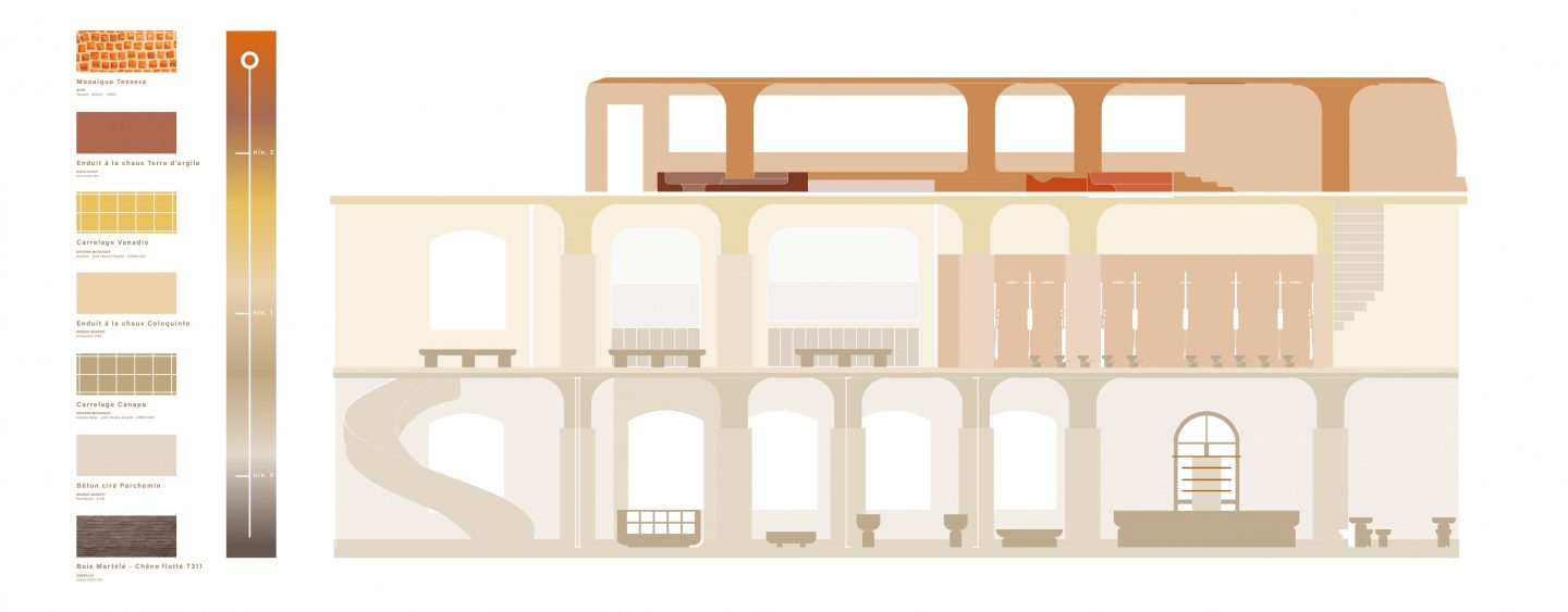 À partir des murs existants de la Maison des Canaux, j’ai choisi de transformer les murs porteurs en un système de colonnes porteuses en bimatière. Ce choix structurel me permet de libérer les espaces, d’ouvrir les circulations tout en participant à la narration sensorielle de l’ensemble.
